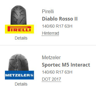 Pirelli Diablo Rosso 2: alt. Metzeler M5: noch älter und wohl im Ausverkauf (DOT 2017). Shinko R-006: kein Kommentar :kopfklatsch: