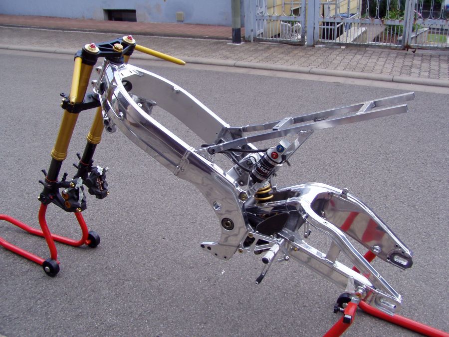 So, heute habe ich angefangen meine RGV zusammenzubauen.... Tygaverkleidung liegt teils schon beim Lackierer, die PVM Felgen müssen leider nochmal chemisch entlackt und neu gepulvert werden, weil das Ergebnis nichts ist. Bis auf den Motor (hole ich Montag bei Guido Förster ab) und diverse Titanteile (Schrauben Umlenkung, Motorhaltebolzen und die Achsen) ist fast alles da.... Der Liefertermin des Polierers der PVMS liegt Ende Juni, also wenn es glatt geht ist sie zum Treffen fertig. Hier die ersten Bilder!