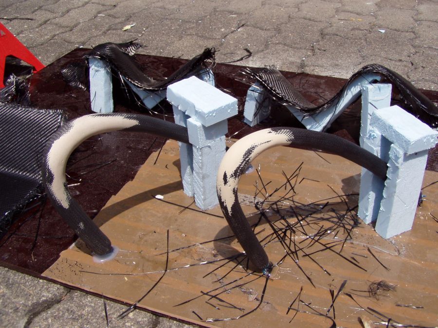 bild 1: im vordergrund die beiden streben meines frontgeweihs im rohbau. passende stücke aus styrodur ausgeschnitten, rund geschliffen, eine lage carbonschlauch drüber, diesen dann schön rund geschliffen und somit fertig für viele mehr lagen kohleschlauch. im hintergrund positiv laminierte untere verkleidungshalter vorne in der front für die tygaverkleidung, links die kohlefaserplatte die mein cockpit trägt und auch ausgangspunkt für die beiden carbonstreben zu den spiegeln ist.