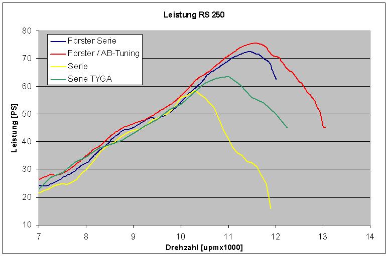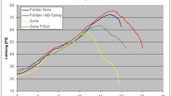 Die Leistungsdrehzahl ist je nach Situation extrem dynamisch. Soll heißen, dass bei langsamer Rumtuckerei die Leistungsdrehzahl plötzlich 500U/min unter dem Normalwert liegt. Entsprechend passt dann die ganze Spielerei mit Kennfeld und Pv-Verstellung nicht mehr. Ist mir bei einigen Leistungsmessungen aufgefallen. Ein paar Mal das obligatorische Gaszupfen im Stand oder ein,zwei durchbeschleunigte Gänge bringen die Anlage wieder auf ihre "optimale" Betriebstemperatur (die sich bei harter Gangart auch nicht weiter erhöht). Evtl. auch ein Grund, warum die GP-Typen auf der Start/Ziel ständig den Motor drehen lassen (mal abgesehen davon, dass die Kerzen bei diesem Ölanteil ohne diese Spielerei vollends zusauen würden).