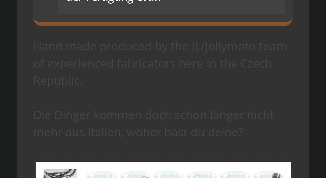 ich krame den Thread einfach mal wieder hoch, da es vielleicht weiterhin einige unter euch gibt, die einen Blick auf die Corsa geworfen haben. Für die Interessierten gleich auch ein paar Daten zu Länge und Umfang (im Vergliech zur Straßen-Jolly), aber auch Warnungen bzgl. Fertigungstolrenzen der Aufnahmen und des Stingers (Motorschadengefahr wegen des Durchmessers!).