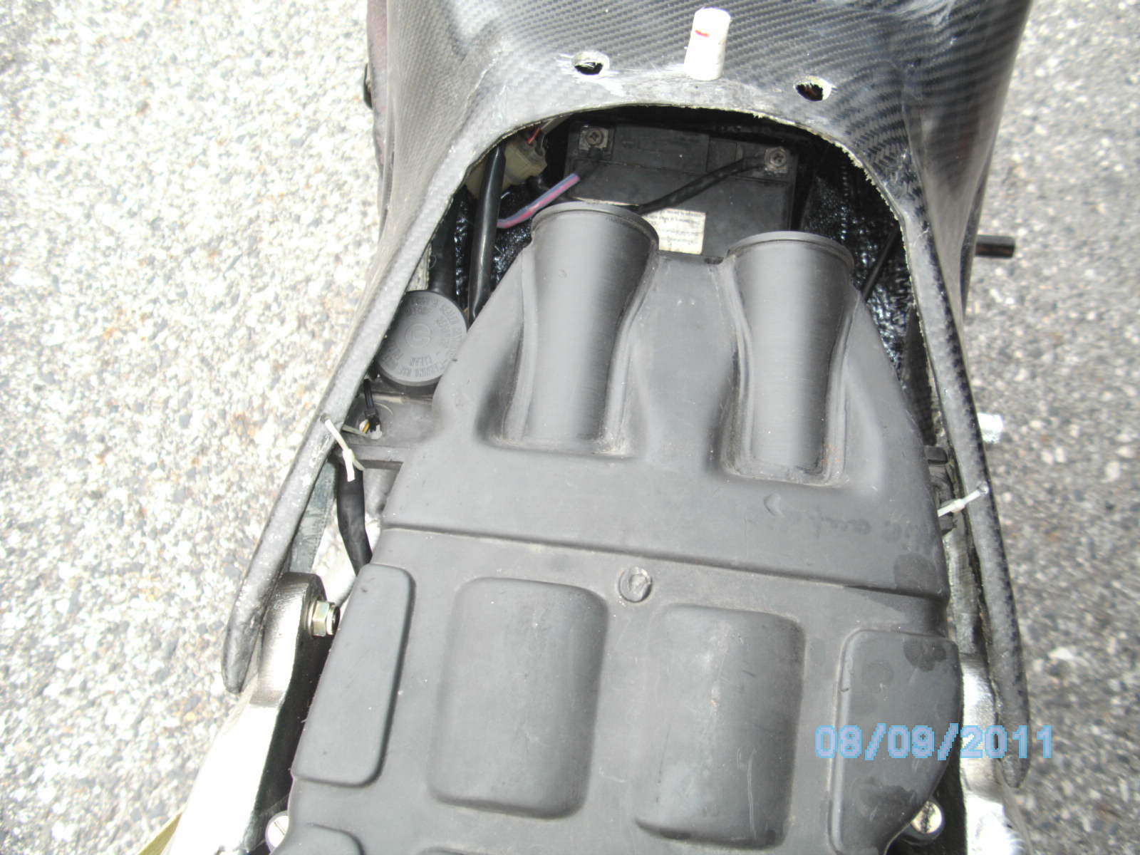• Wie gesagt, es ist ein Prototyp der zuerst auf Stabilität ausgelegt. Sichtcarbon ist angestrebt. Der Bürzel wird normal geschraubt und der Unterboden ist durchgehend glatt. Batterie und CDI sind im Unterboden halb versenkt, der Unterboden ist fest verbunden und hier noch aus GfK. Zur Gewichtserleichterung und Torsionsstabilität wird die Gabelung zwischen der Heckbefestigung geschlossen.