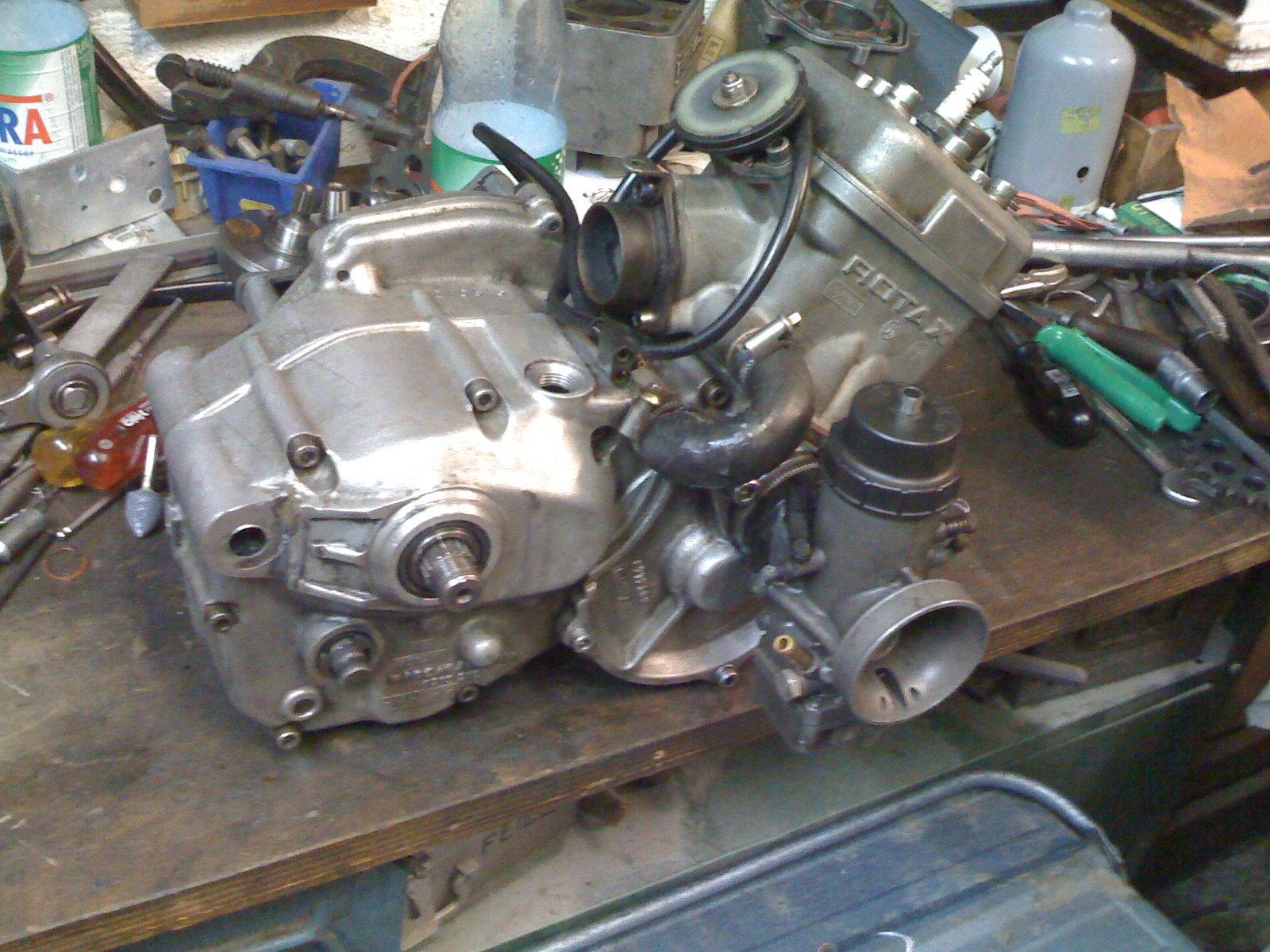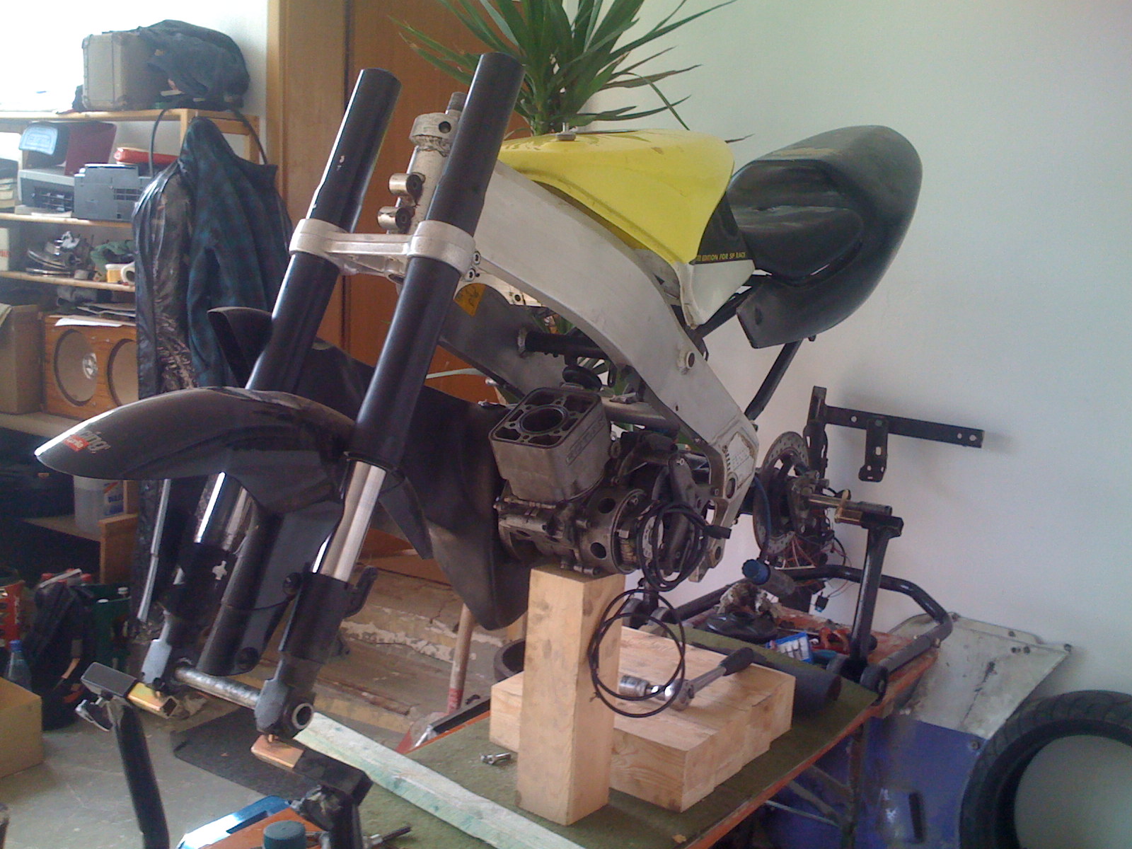 Motor hat jetzt einen Conti Zylinder bekommen mit seperaten Brennraum. Vergaser steckt, wie zum schluss letztes Jahr schon, ein 26er Mikuni dran. Zur Leistung kann ich leider noch nichts sagen. Ich schätze mal so um die 14-15 Hinterrad PS. Aber damit ist ja nicht viel gesagt, denn das Band und wie es sich auf der Strecke fährt sind ja auch noch wichtige Faktoren.