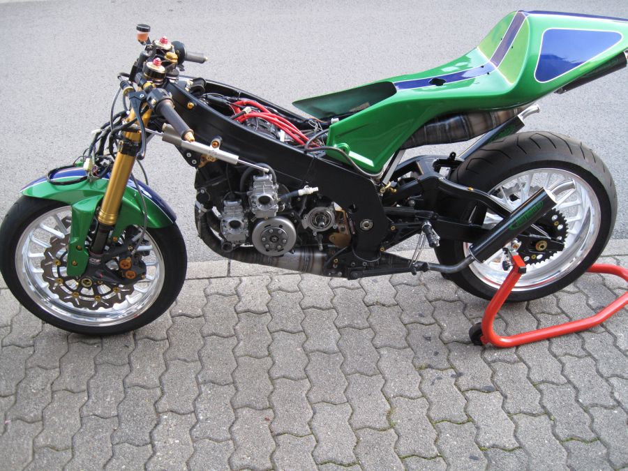 - Die Adaption des RG 500 Motors in den RGV Rahmen ohne Rahmenausschneiderei oder Schweissen. Das Ganze aufgebaut mit schönen und technisch hochwertigen Komponenten. Leistungsmäßig habe ich es erstmal bei GHN Drehschiebern in Verbindung mit Jollys und aufgedrehten Vergasern beruhen lassen. Ich denke das ist für den Straßenbetrieb mehr als ausreichend, zumindest für meinen Geschmack.