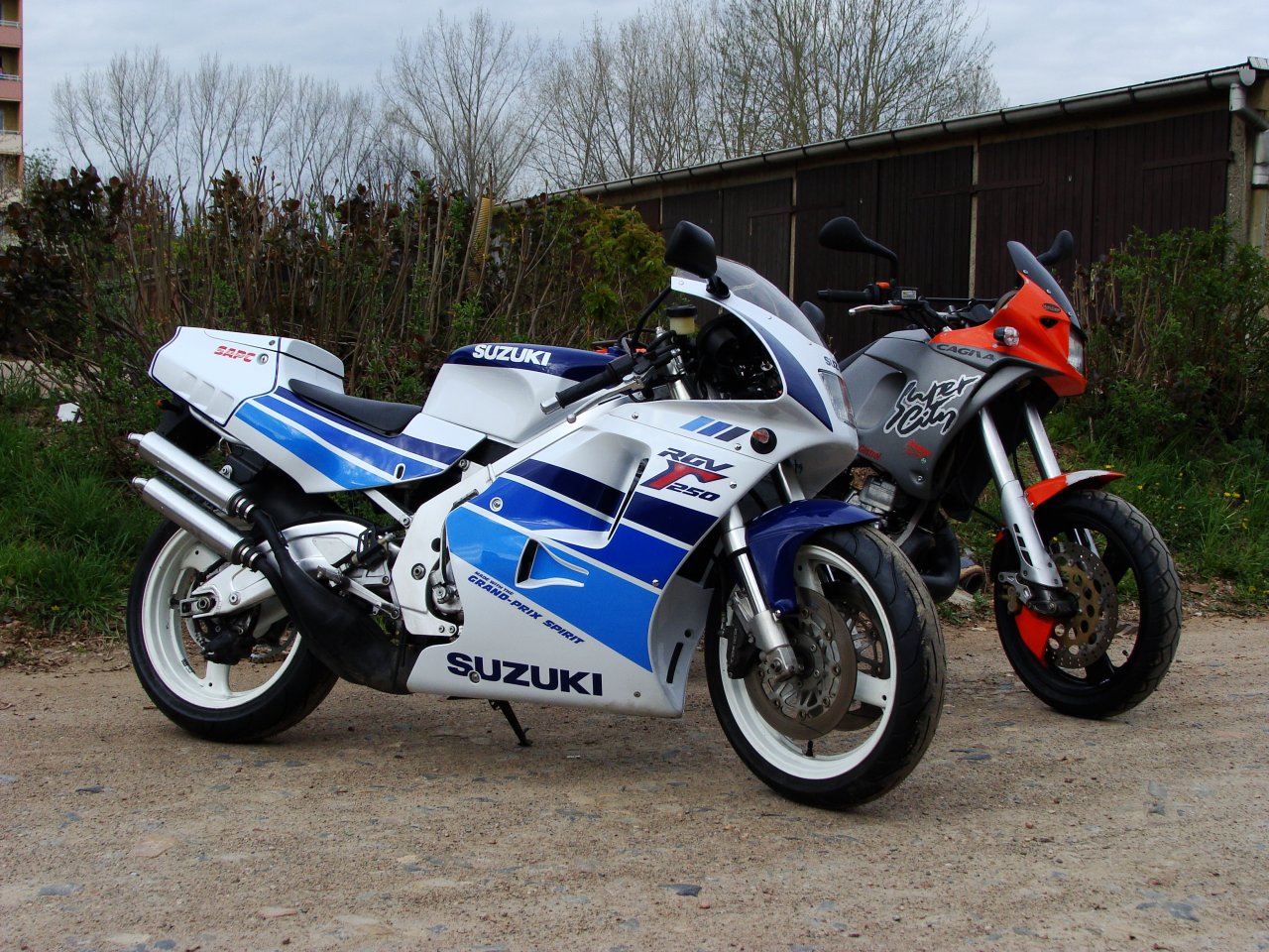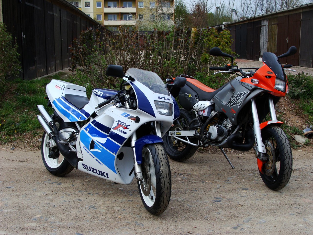 Will ich doch auch meine zwei Zweitakterchen vorstellen: Suzuki RGV 250 Bj. 1991 und Cagiva Supercity 125 Bj. 1999. Die RGV hat 13.500 km runter und ist bis auf die Miniblinker und Försterschieber original (bleibt auch so). Die Supercity für den Alltag hat irgendwas um die 26.000 km auf dem Tacho, paar Kampfspuren vom Vorbesitzer, aber ebenfalls original.