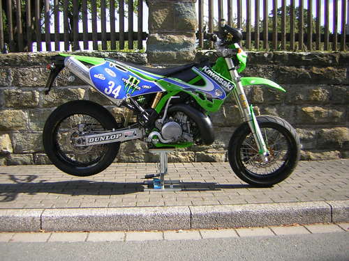 wer eine low budget kx 500 supermoto basteln will, kann sich die räder und das bremsgedöns der rgv ranbauen. passt gut zusammen ohne viel bastelei und für den spass ist die bremswirkung ok. habe damals als erste supermoto eine heruntergekommene kx 500 auf die schnelle gebastelt und viel spass damit gehabt. hier ein bild von dieser abgerockten kiste.