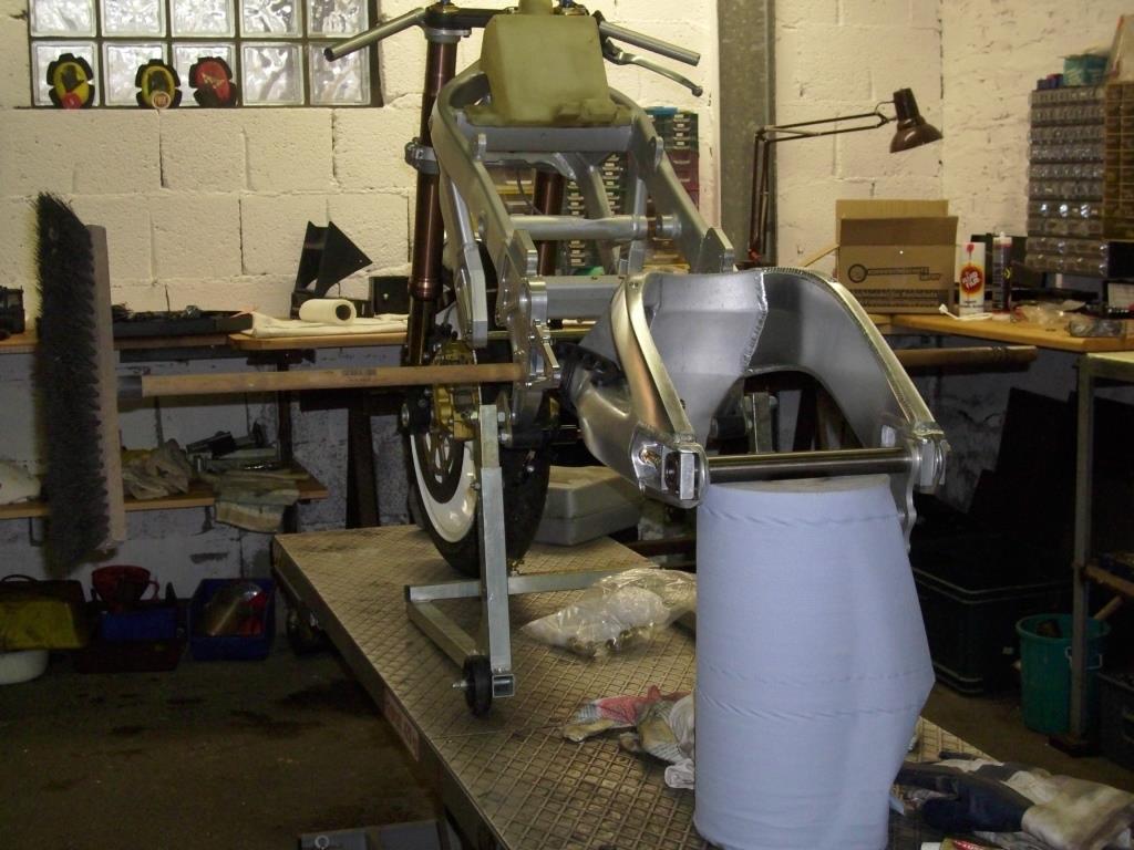 Aber Schwingenachse , Federbeinumlenkung und Federbein sind schon mal ,, besorgt ,, und montiert , die Hinterachse passt in die GSXR Felge und der Bremssattelträger der auch gleichzeitig der Kettenspanner ist , kann auch benutzt werden :like: