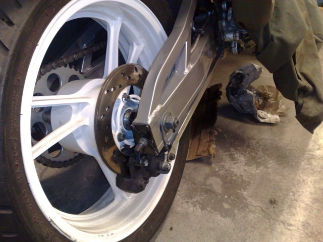 In front I used the GSX600F wheel instead. It is 17” and has brake discs (290 mm) that fit bolt on together with GSXR1100 -86/87 calipers without any bracketry in the stock forks. Just remember to change the MC to a 16 mm bore and turn down the discs 2-3 mm on the diameter. This wheel I had widened from 2,5” to 3,5”. All stock spacers fit so it is a bolt on mod. This is probably the best mod I have ever done to the bike when you measure bang for the buck. Lighter wheel than stock with brakes that are miles better than stock ones and much better stability from the modern tire profile.