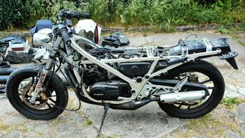 Das Motorrad befindet sich in einem Teilzerlegten Zustand.