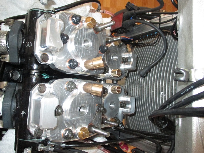 Ich habe endlich die ersten MRG Köpfe für meine RG500 fertiggestellt. Wie ihr auf den Bildern sehen könnt sind die Karlotten zum raus nehmen was mehrere Vorteile haben kann. Gerade was Quetschkante einstellen angeht. Abgedichtet werden die Köpfe über O-Ringe und somit braucht man keine Kopfdichtung mehr. Vom Gewicht her könnte ich etwas einsparen wie man auf den Bildern sehen kann. Den Wasserablauf Richtung Kühler habe ich mit Kupferrohr aus dem Baumarkt passend für meine RG gelötet. Wenn Interesse besteht würde ich eine Auflage fertigen.