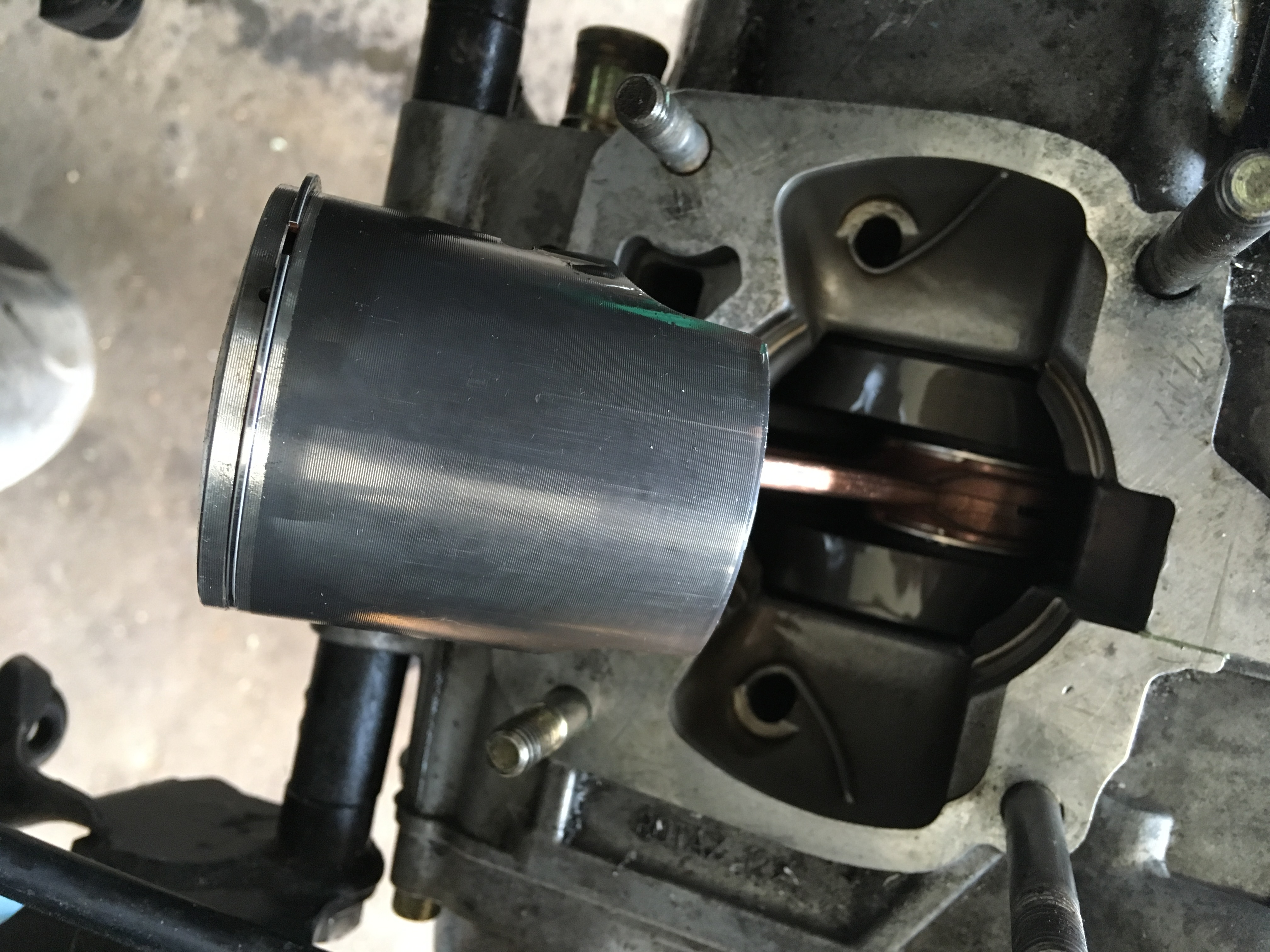 • Nachdem mein Motor brandneu aufgebaut ist und ich sie jetzt einige Male im Leerlauf lassen habe, mit immer wieder kleinen gasstösen, paar mal hoch gedreht, abkühlen lassen und 2, 3 mal auch alle Gänge auf 3/4 Gas durch geschaltet habe (auf einer geraden Strecke), habe ich nun mal den Auspuff abgebaut und nach dem Kolben gesehen. Als ich eine riefe sah, natürlich auch gleich mal den Zylinder runter genommen. Einlassseite hat normale gebrauchsspuren. Am Auslass wirklich nur die eine Riefe, die man aber mit dem Fingernagel spürt. Was meint ihr? Ursache? Neuen Kolben rein, oder wieder zusammen bauen für ein Renn Wochenende?