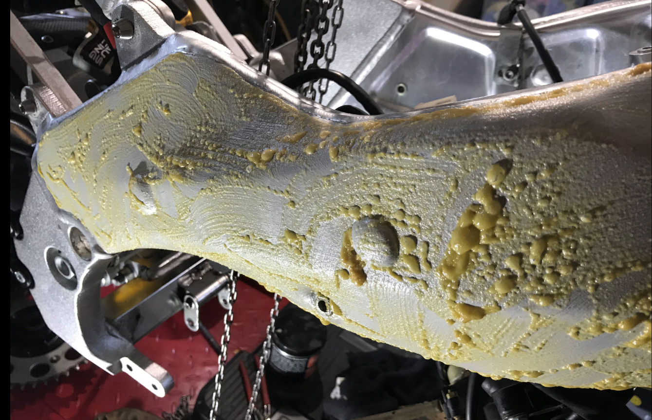 • :mecker: das muss schneller gehen! Der Rahmen war ziemlich runtergerockt, als ich die RS gekauft habe. Irgendwer hatte bereits versucht, Kratzer auszupolieren. Schleifen war keine Option, also den Chemiebaukasten rausgeholt: