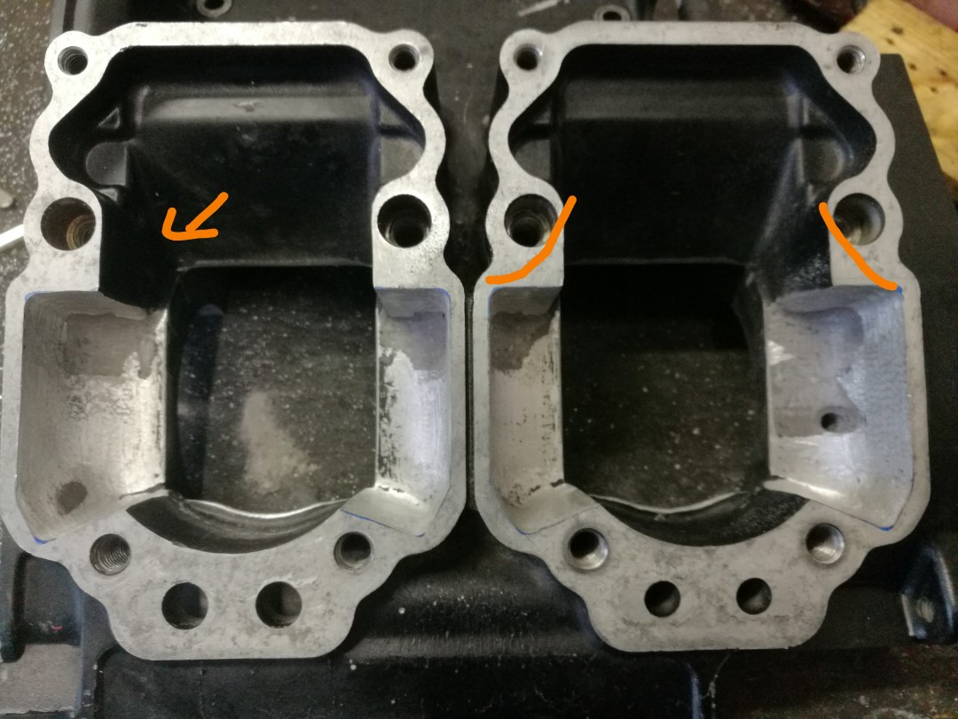 Gestern hab ich mich der oberen Gehäusehälfte gewidmet, die ganzen eckigen Stufen wurden mit Haftstahl aufgefüllt und die Kanäle an den Zylindern angepasst. Im Vergleich vorher/nachher.