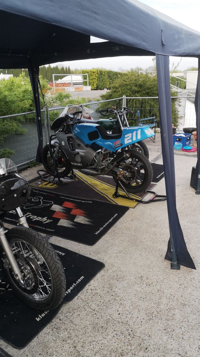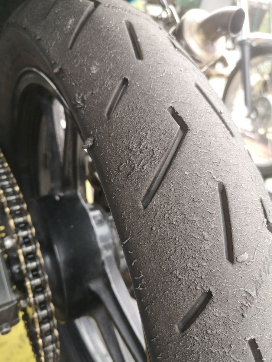 Vorn ist noch der Avon Am26 classic racing in 90/90 18" drauf. Aber ganz klar, er läuft thermisch an der Grenze. Der wird noch abgerubbelt und dann kommt der Conti RA 3cr drauf.