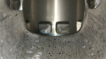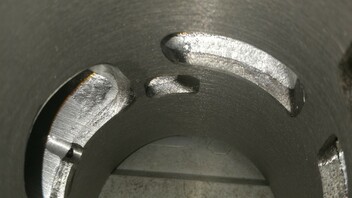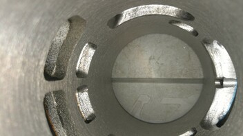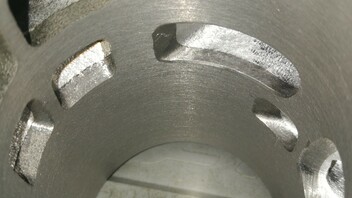 Derweil hab ich noch den Fräser geschwungen und den ersten Zylinder bis auf den Einlass fertig (wird erst gefräst wenn Kolben da, zwecks Länge) Hauptauslass 195° Nebenauslässe 190° Überströmer 133°. Die hinteren Strömer hab ich diesmal nur sehr wenig bearbeitet. Bei der ersten Testversion wurde der Gasstrahl zu sehr zerstreut.