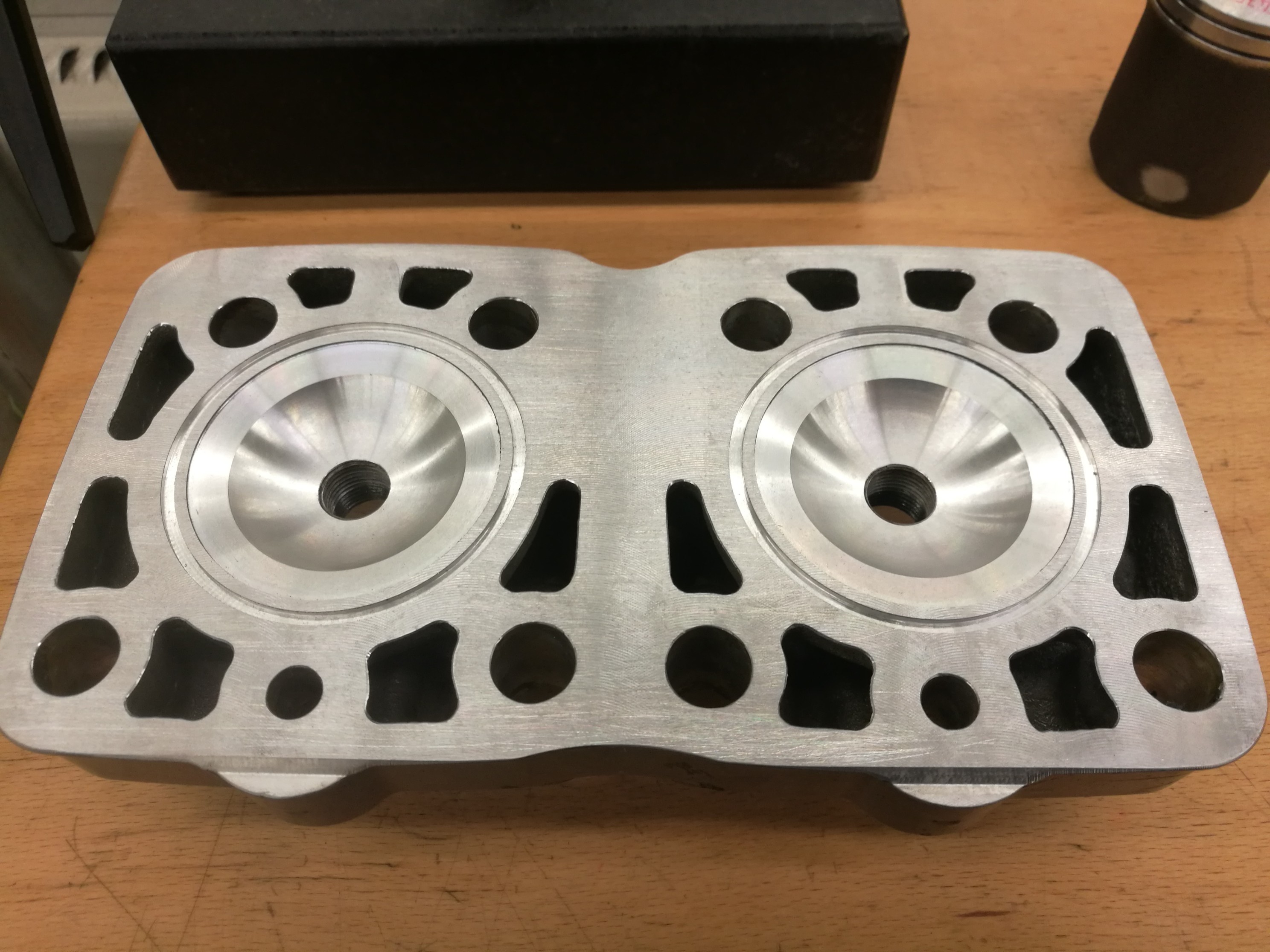Die Gt 250 Kolben hab ich mir zurecht bearbeitet. Interessant sind die Kolbenringe, die schimmern Goldlich, vermutlich sind sie Tin-beschichtet. Anlassfarbe kann ich ausschließlich, da ich mit einem Polierflies die Oberfläche nicht metallisch Blank polieren konnte. Zu den Kolben hab ich nochmal ein neues Köpfchen gedreht.