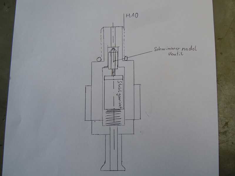 Genau da war ein Messing oder Stahl abgestufter Prömpel drin. Das mit dem Nadelventil und der Feder habe ich nicht gesehen. Bei mir viel das Stahlgewicht quasi von allein hin-und her. War eventuell die Feder weggegammelt denke.
