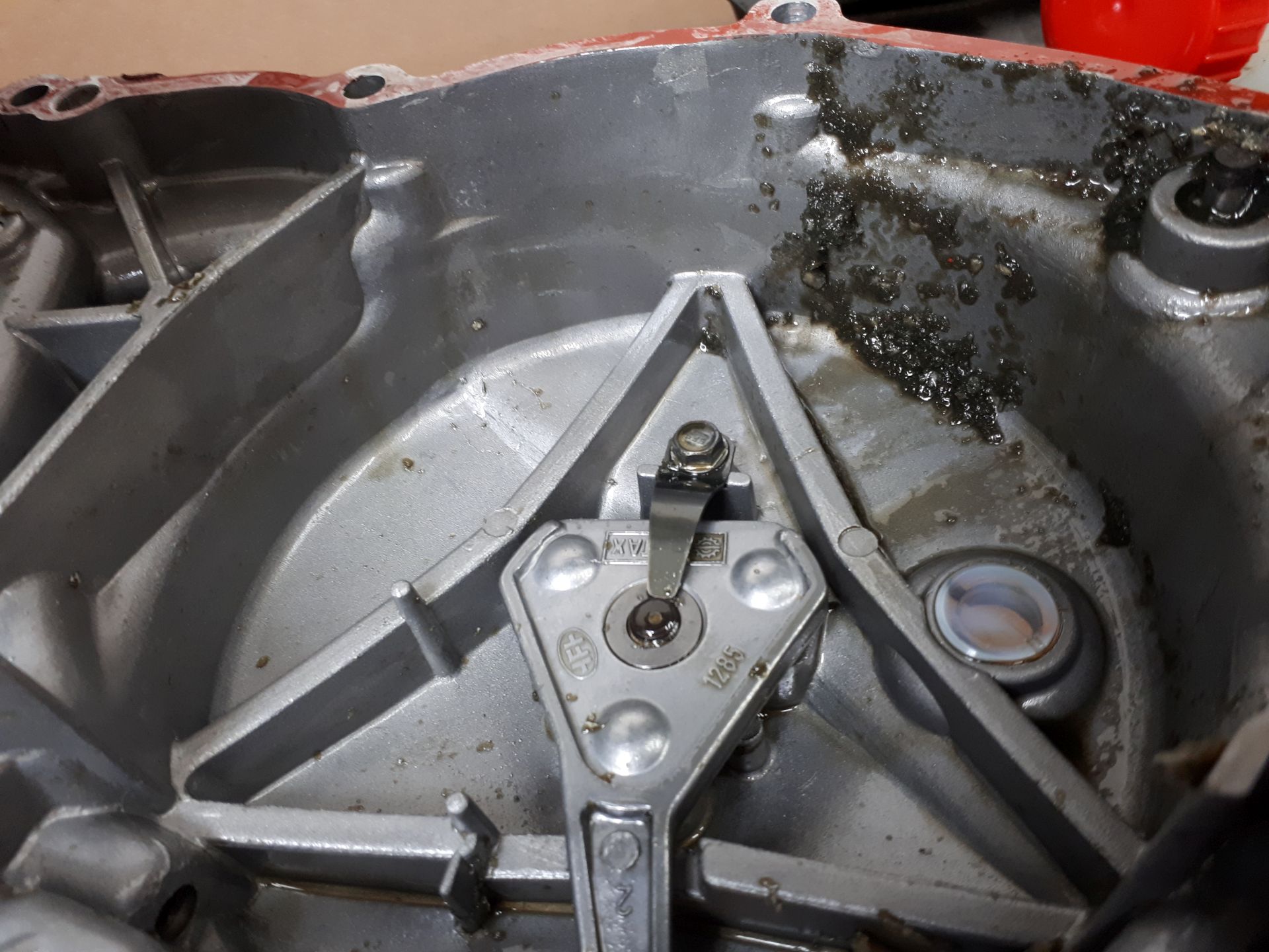 In der Werkstatt den Zylinderkopf in der Ahnung eines Hitzeklemmers entfernt aber keine Spuren sichtbar. Kupplungsdeckel entfernt und wieder ein komplett zerstörtes Kunststoffrad auf der Kurbelwelle gefunden (s. Fotos). Durch den Kunststoffabrieb würde ich wieder gezwungen den ganzen Motor zerlegen und alles reinigen.