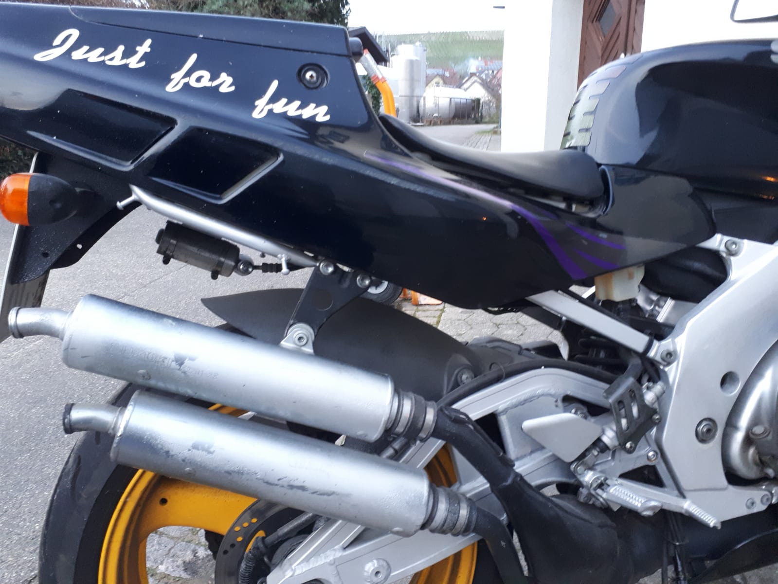 Zuhause angekommen machte ich mich erst einmal daran, die Verkleidung aufzubereiten. Das hieß erstmal viele Aufkleber zu entfernen und auch Zink Spray, dieses hatte der Vorbesitzer nach einem Rutscher rechts auf die Endtöpfe gesprüht, ohne andere Sachen, wie Schwinge usw. abzudecken ![]()