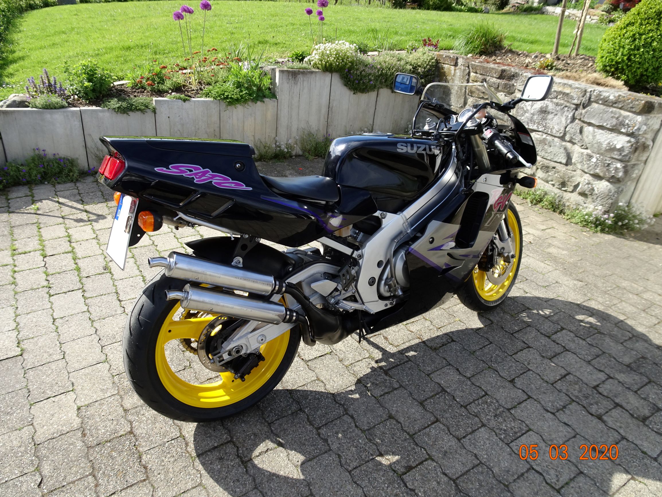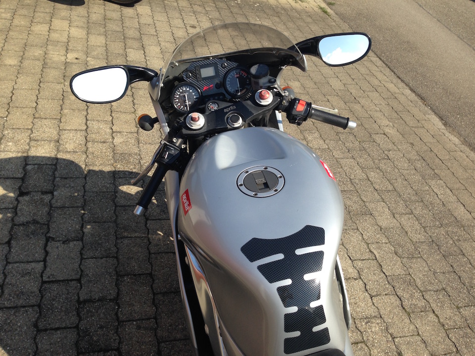 Neu kamen dann noch Reifen, Radlager, Bremsbeläge, Bremsscheiben, Auspuff ohne Kat, Vergaser-Überholung mit neuen Düsen, Schieberkontrolle, Kühlwasser, Kettensatz, diverse Aufkleber von TheImageWorks (diese SAPC hinten und einer der RGV an der Seitenverkleidung).