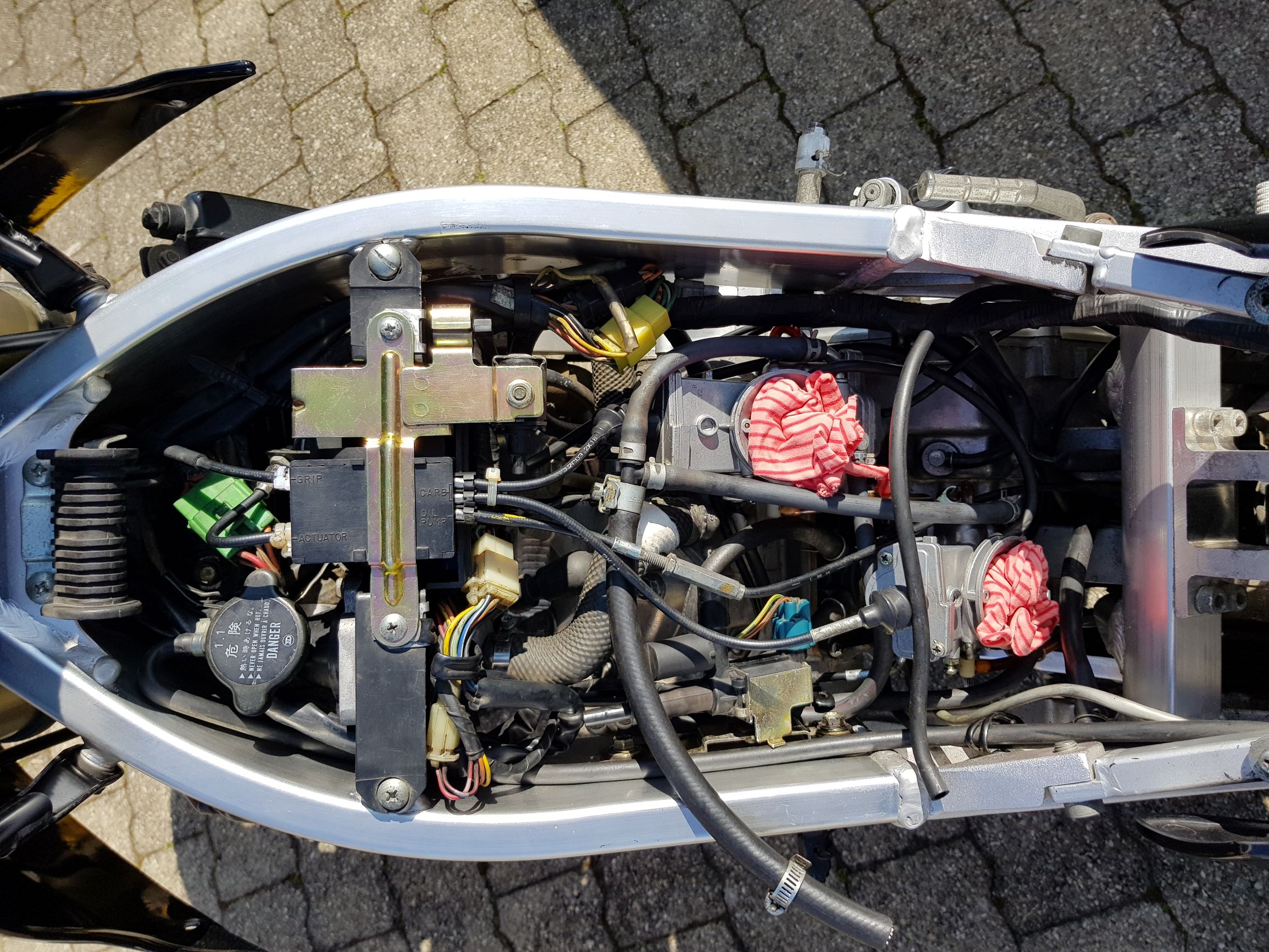 Neu kamen dann noch Reifen, Radlager, Bremsbeläge, Bremsscheiben, Auspuff ohne Kat, Vergaser-Überholung mit neuen Düsen, Schieberkontrolle, Kühlwasser, Kettensatz, diverse Aufkleber von TheImageWorks (diese SAPC hinten und einer der RGV an der Seitenverkleidung).