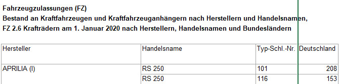 @Tante: Alle grau eingeführten Fahrzeuge werden hier wohl nicht auftauchen. Auch eine Honda NSR250R gibt es in der Datei nicht. Ebeso werden die TZR V2 fehlen. Wahrscheinlich gibt es für die Dinger alles zusammen so einen Pool mit Typ und Ausführung 0000... . Steht so auch im Brief meiner V2, die zählt offenbar nicht unter Yamaha.