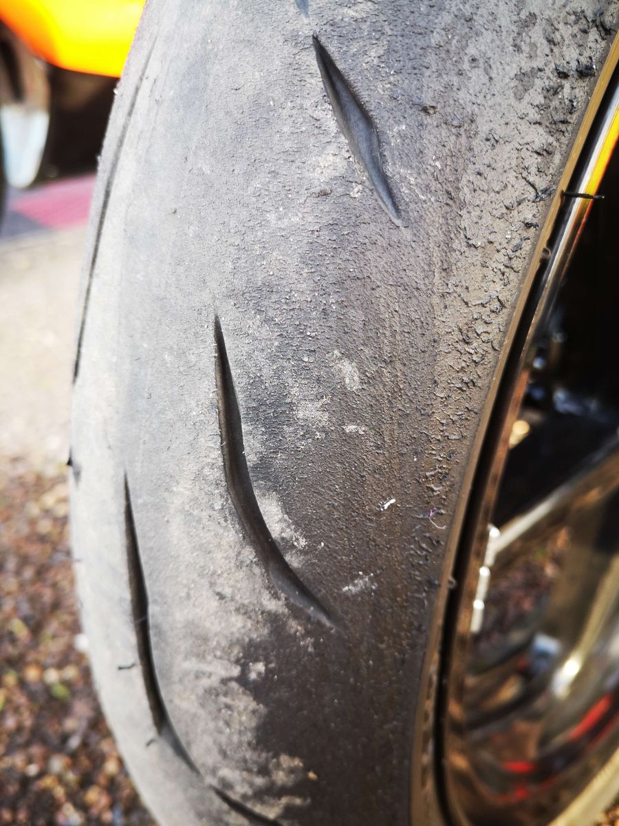 Reifenbild aber gut, schön leicht schuppig in det mittleren Flanke. Tempetatur Hinten nach dem Rausfahren bis zum Parkplatz max 55 Grad. Vorne eher 45.