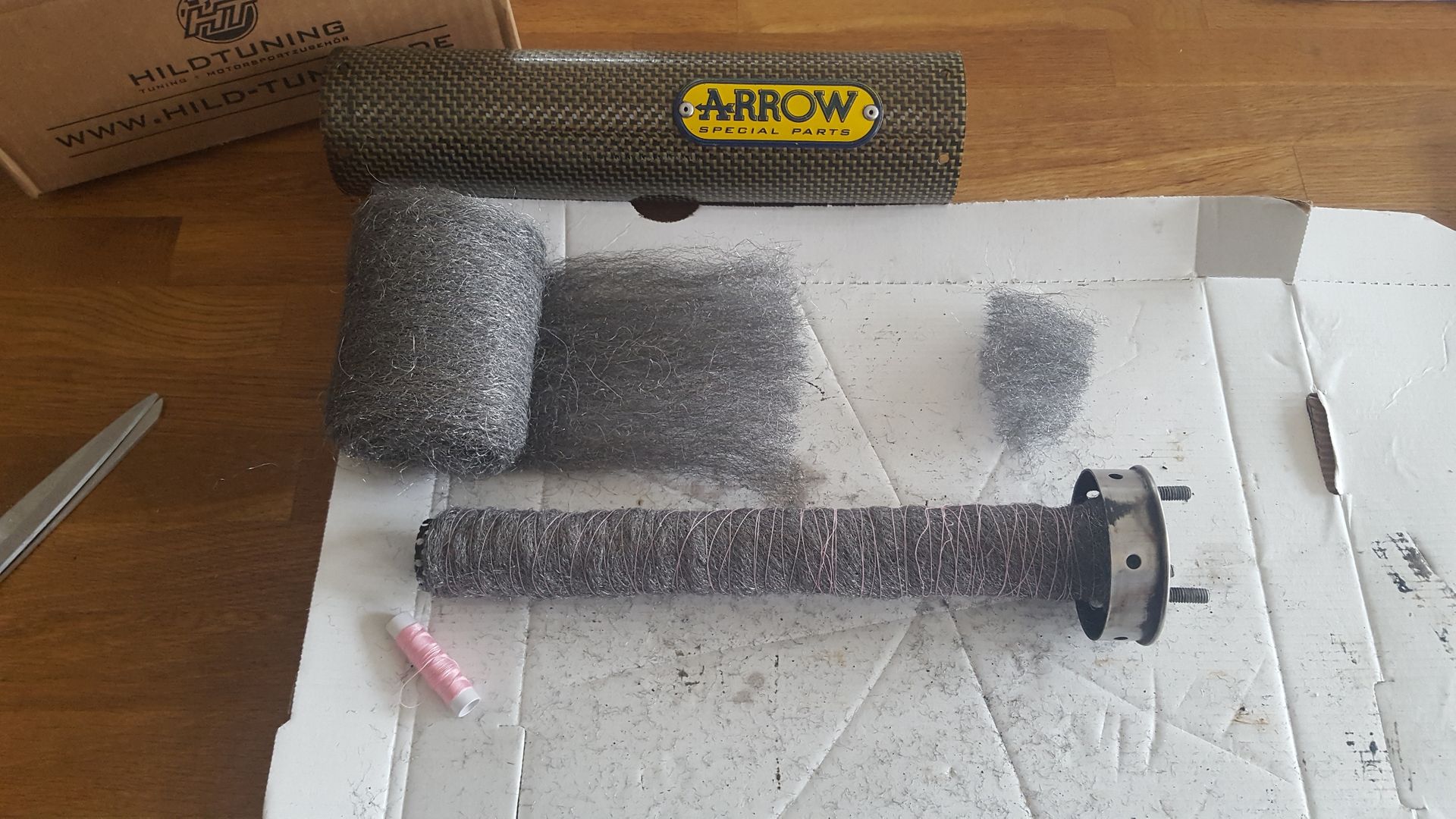 Den Dämpfer hab ich schonmal frisch gestopft. Dünne Lage Edelstahlwolle, und 140g Auspuffwolle.