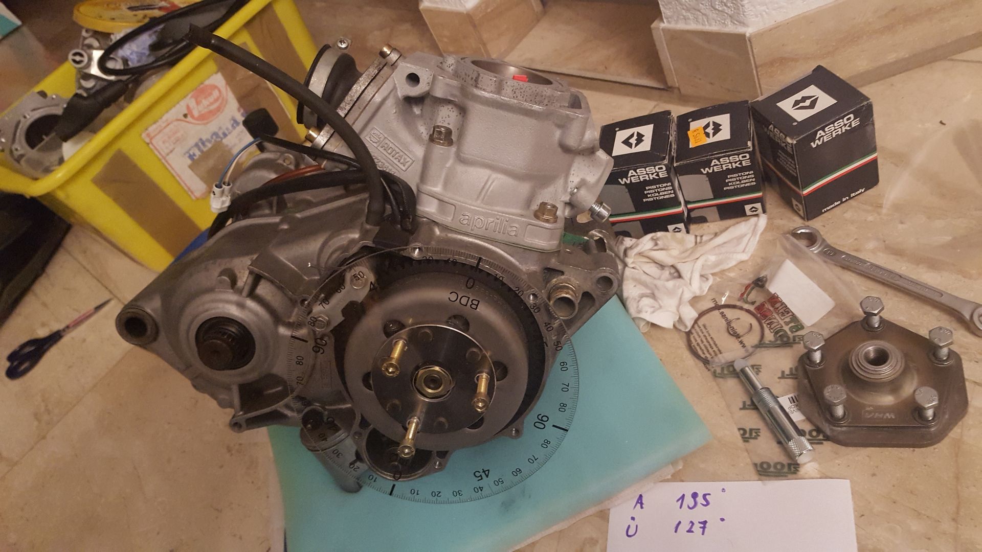 Der bekommt meinen bearbeiteten Zylinder, auf 195 / 127 Grad verbaut, was dann mit dem Kopf 0.8mm QS und 13.7:1 ergibt.