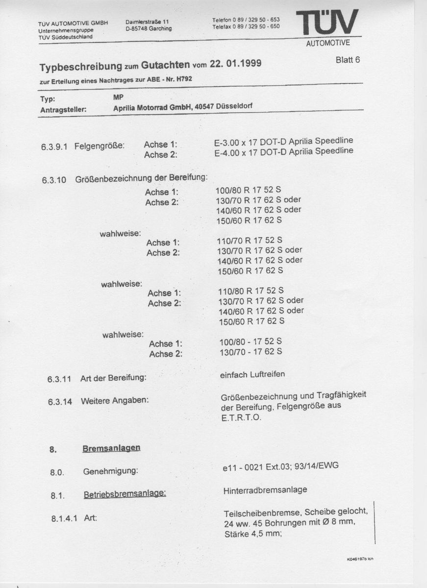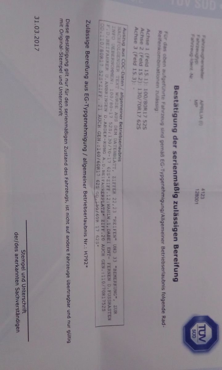 • Ich suche für ne MP(b) das COC wo alle erlaubten Reifengrößen aufgeführt sind, bei der RS125 die ich hier stehen habe ist 100 /130 eingetragen, wasja etrwas suboptimal ist :face: