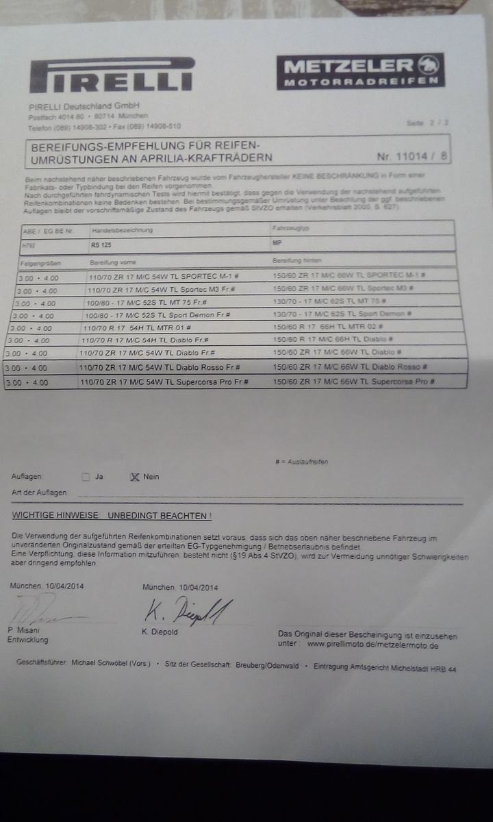 • Für die Eintragung reicht oft eine Reifenfreigabe vom Hersteller, anbei mal eine von Pirelli/Metzeler