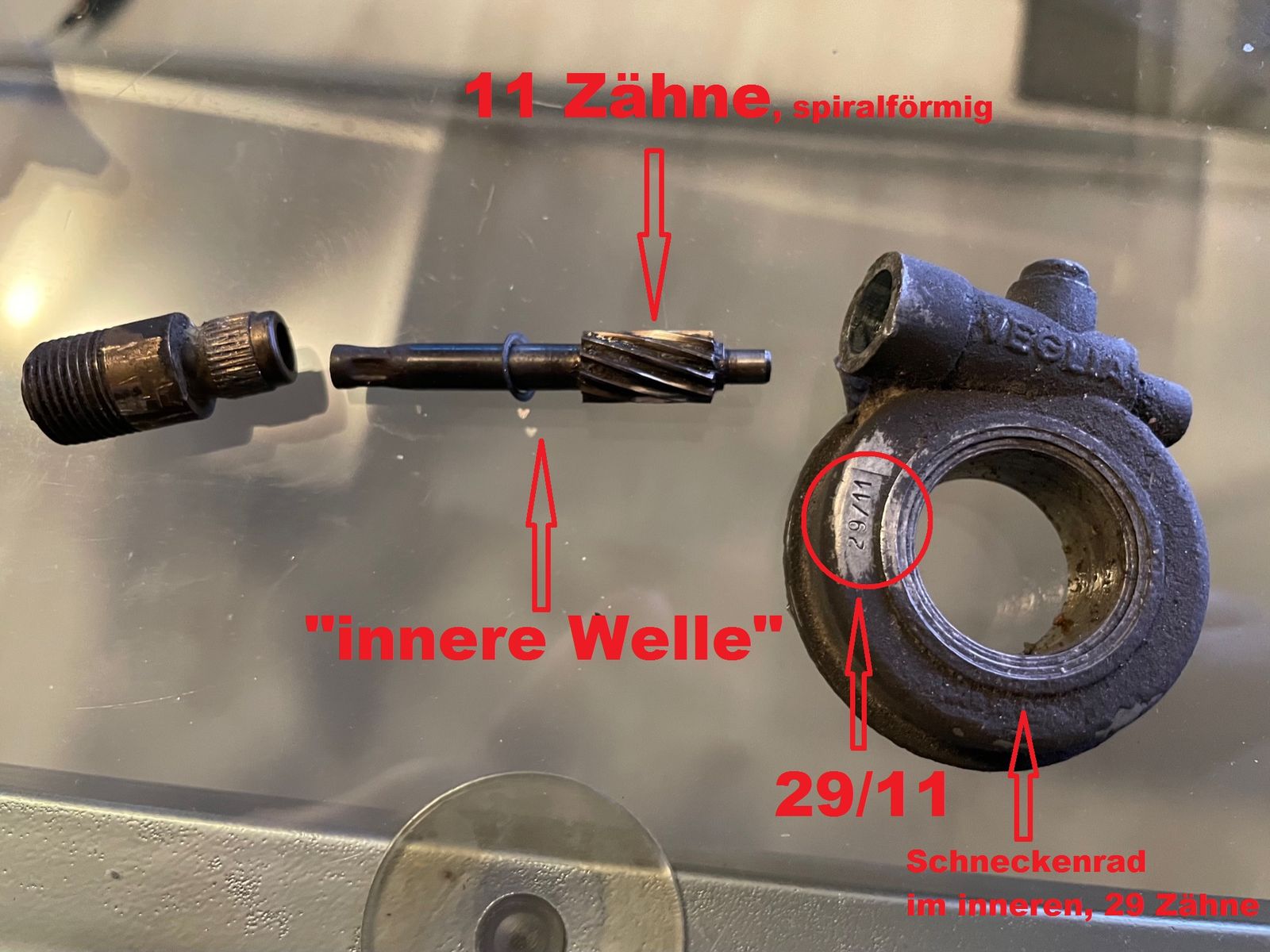 Aus der defekten '96er Tachoschnecke habe ich nun die "innere Welle" bzw. Schnecke entnommen, diese hat 11 spiralförmig angeordnete Zähne. Das Gegenstück (Schneckenrad) im Gehäuse hat beim defekten Teil 29 Zähne. Bei der Tachoschnecke, die ich reparieren will, hat das Schneckenrad nur 21 Zähne .. ergibt sich daraus automatisch ein abweichender Winkel der Zähne von Schnecke zu Schneckenrad? Oder anders gefragt: Kann ich die innere Welle aus einer 29/11 Schnecke in eine 21/11 Schnecke einsetzen, ohne dass sich das direkt wieder zerreibt?
