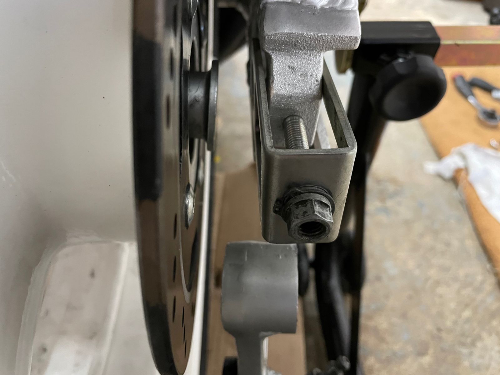 + auf der Seite der Bremsscheibe ist nicht mehr genug Platz um die Radfixierung mit Bremssattel zu montieren (hier fehlen nicht nur 3,4 mm...)
