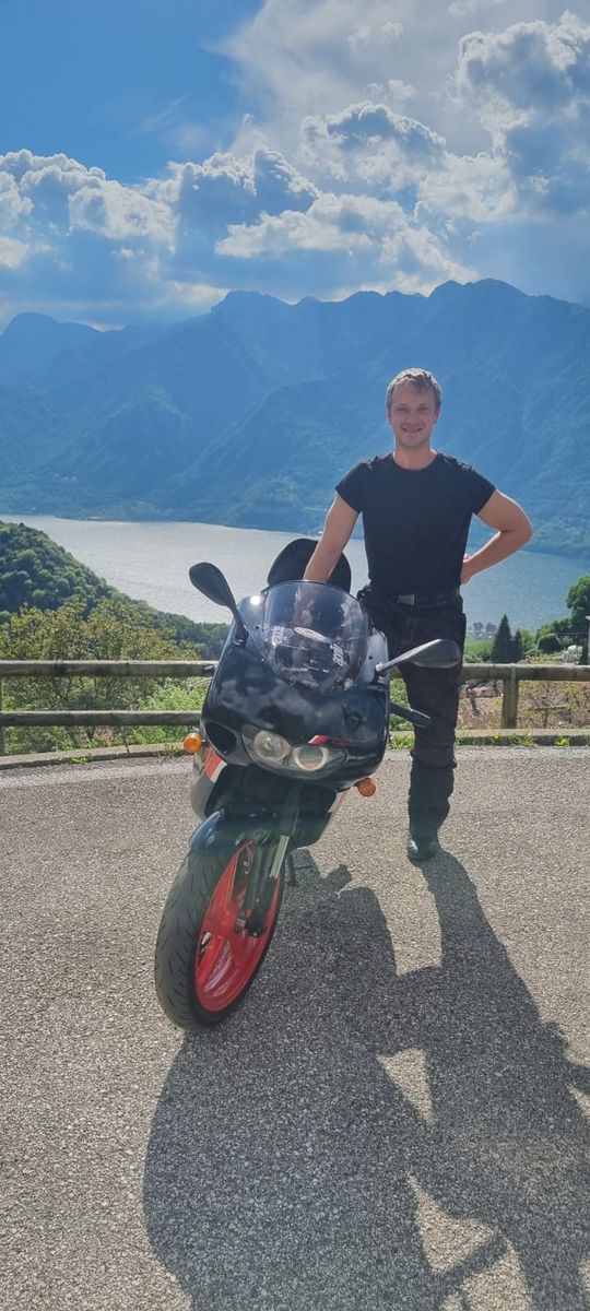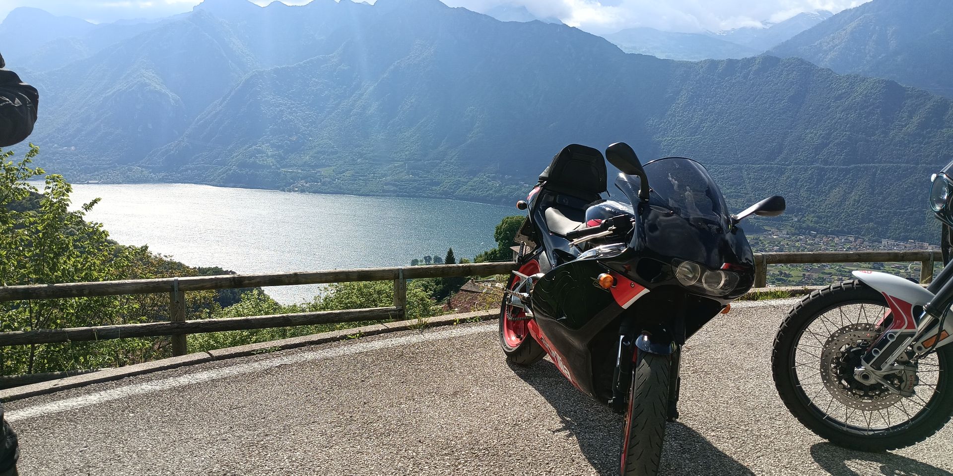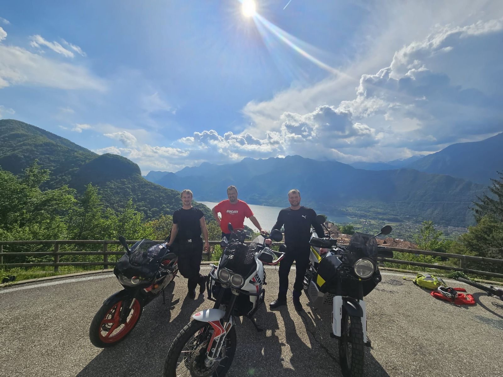 Bis Sonntag bin ich ja in Italien, angereist mit Bus, wo die RS verstaut war. Unser Lager ist am Lago di Ledro und von den 5 Tourteilnehmern bin ich natürlich mit 125ccm der Kleinste. Alle über 900/1000ccm.