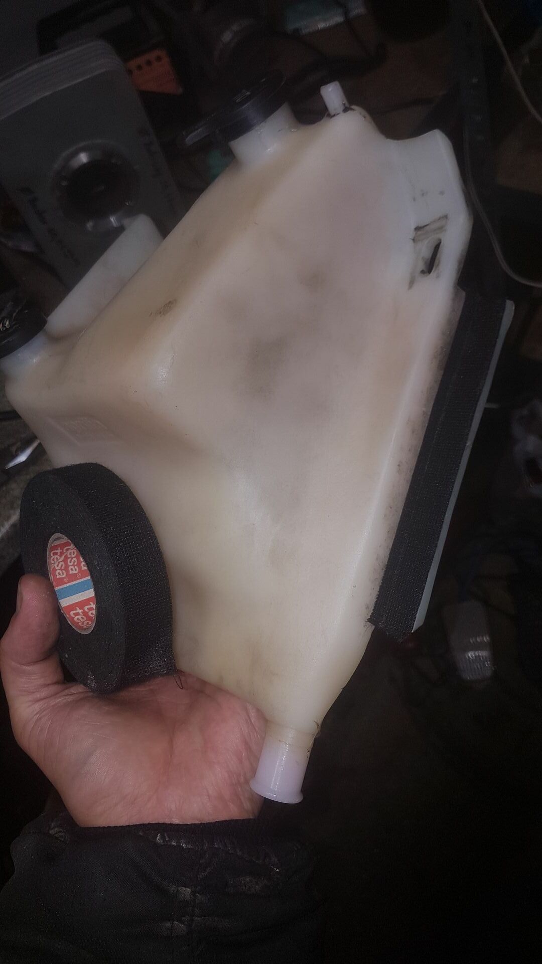 Am Rahmenheck (auch 2K Lackiert) habe ich die "Bodenplatte", Rücklicht, Blinker Kennzeichenhalter, Sitzbankschloss und Ölbehälter angebaut. Damit der Ölbehälter nicht am Heckskelett scheuert wie es original der Fall ist, habe ich einen Streifen Gewebeband aufgeklebt.