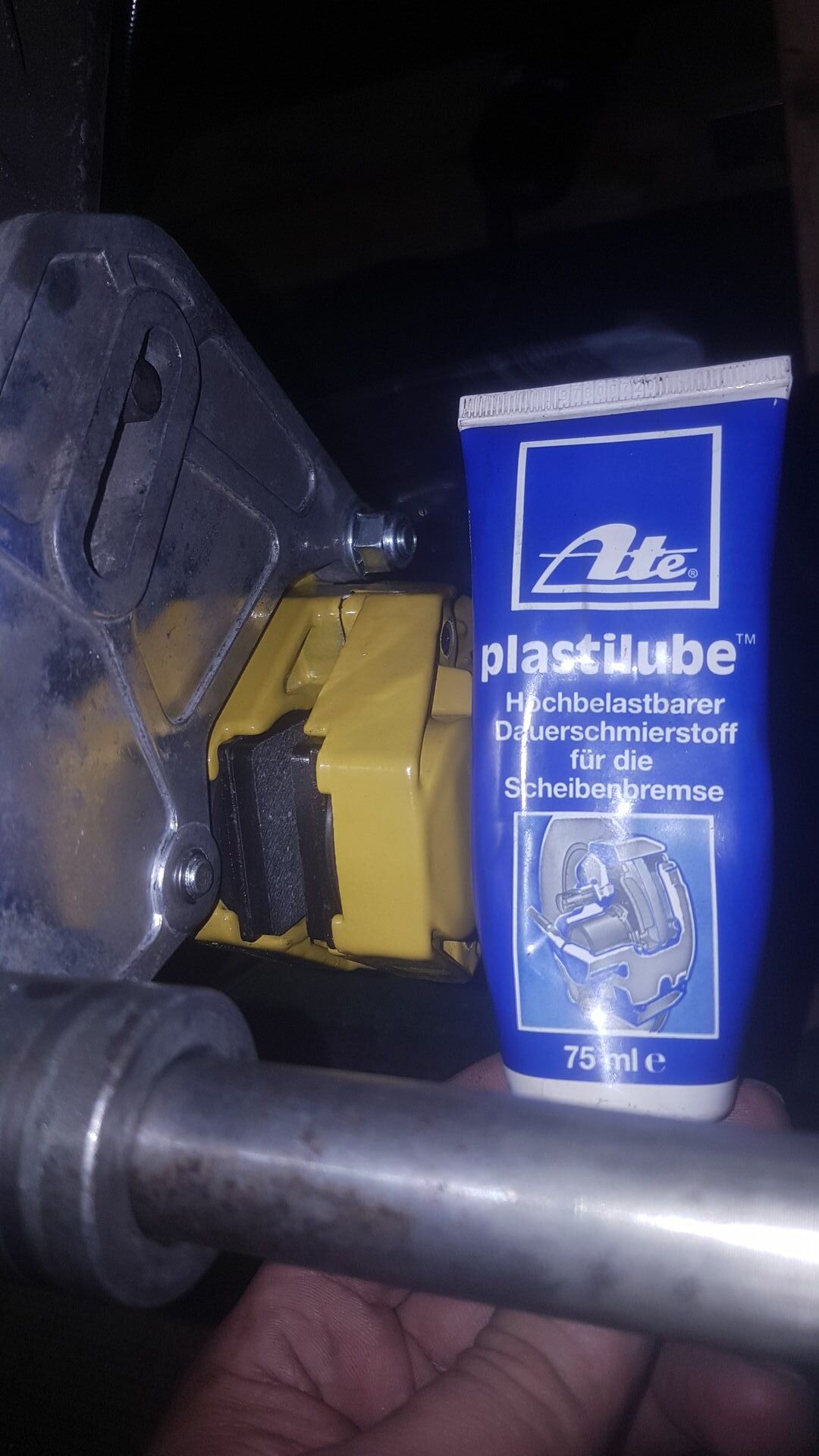 Für die Bremszangen verwende ich Plastilube als Gleitmittel und Korrosionsschutz. Das Zeug kommt dünn mit dem Zeigefinger aufgetragen auf die Bremskolben, die Rückseite der Bremsbelagträgerplatte, auf den Haltebolzen und auf die "Spange" welche von oben auf die Bremsbeläge drückt.
