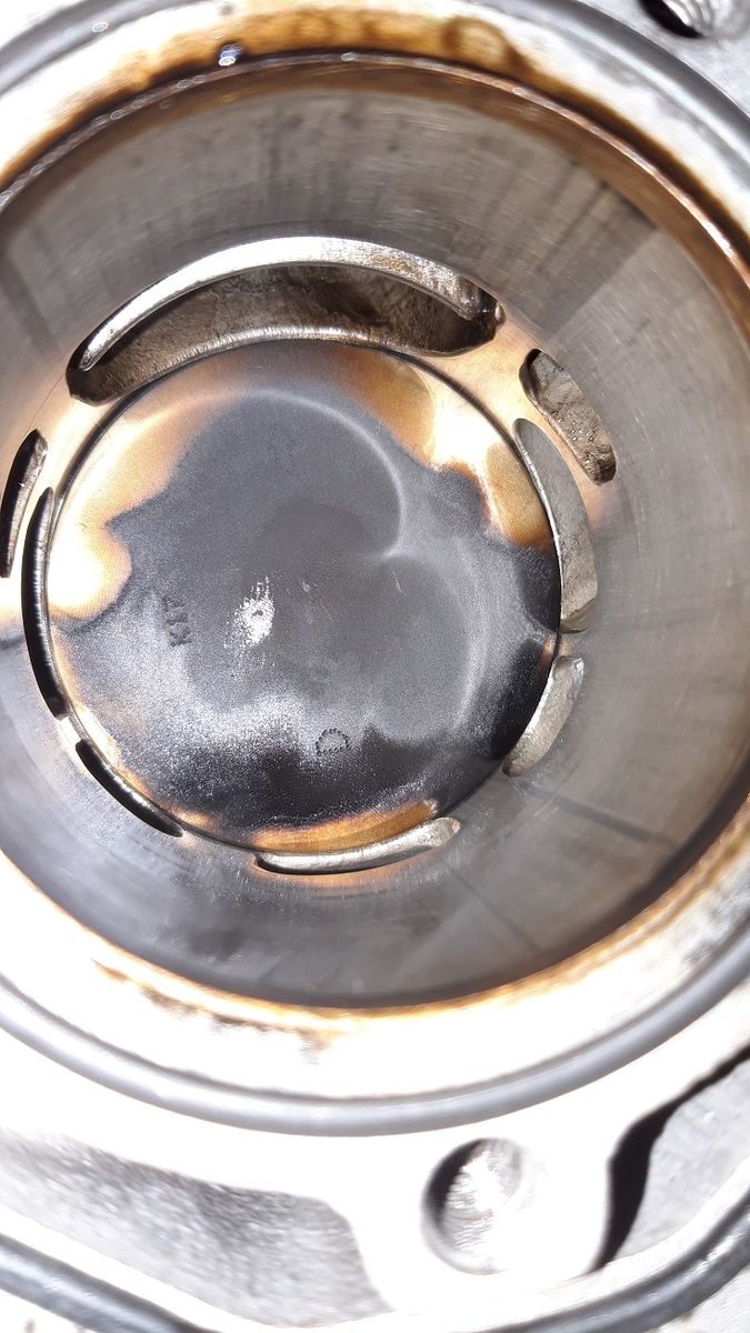 Lange still hier gewesen, ich hatte ein paar Sachen an der RS zu ergründen, fertig bin ich aber nicht. Laufleistung 19km, dann habe ich den Auspuff für eine längere EGT Sonde abgeschraubt, was ich durch den Auslass sah, fand ich nicht so schön, deswegen habe ich den Zylinder gezogen. Viele unterschiedlich breite Striemen exakt auf der Ringlaufbahn. Die Striemen sind nicht nur oberflächlich, sondern der Honschliff ist an den betroffenen Stellen auch weg, zusätzlich sind die Bereiche von kleinen silbernen Kügelchen überzogen, welche allerdings erhaben sind. Diese scheuernde Oberfläche hat an den betreffenden Stellen am Kolben für glänzende Stellen gesorgt.