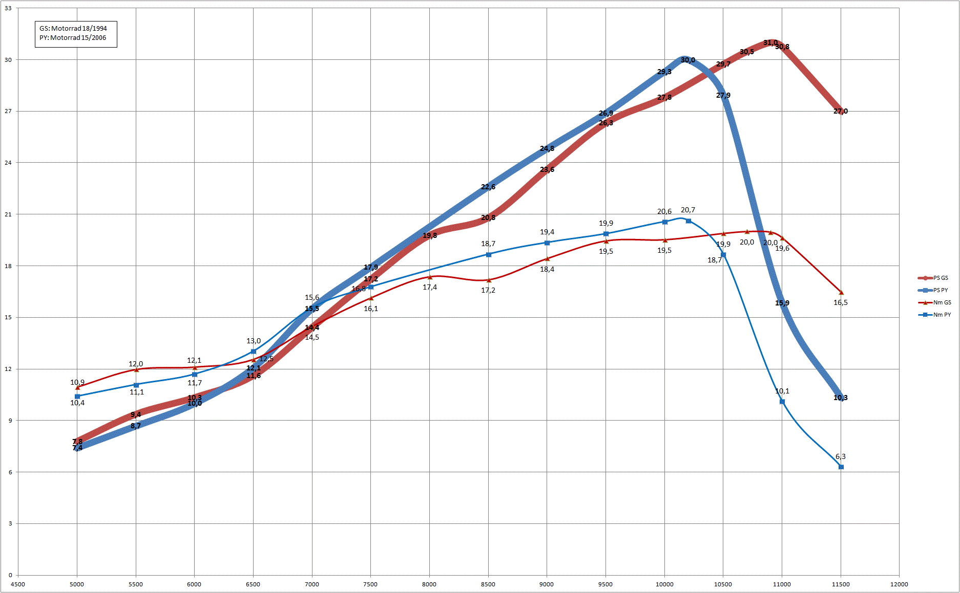Hier mal Drehmoment und Leistung von einer GS und einer PY in einem Diagramm gegenübergestellt.