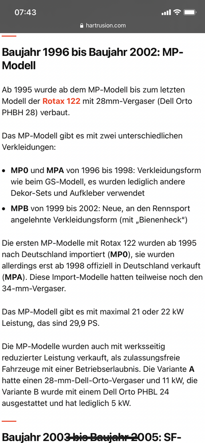 genau sowas hatte ich 2013 auch mal, siehe mein Vorstellungsthread Meine hatte ebenfalls 23 KW eingetragen mit dem Rotax 122 und war Bj. 1996. Hat deine auch nen 34er Dellorto von Werk aus?