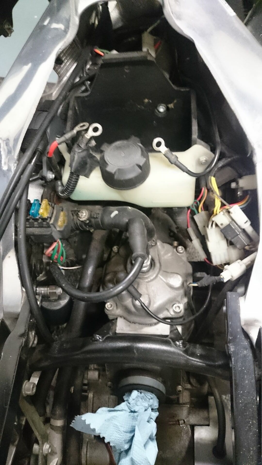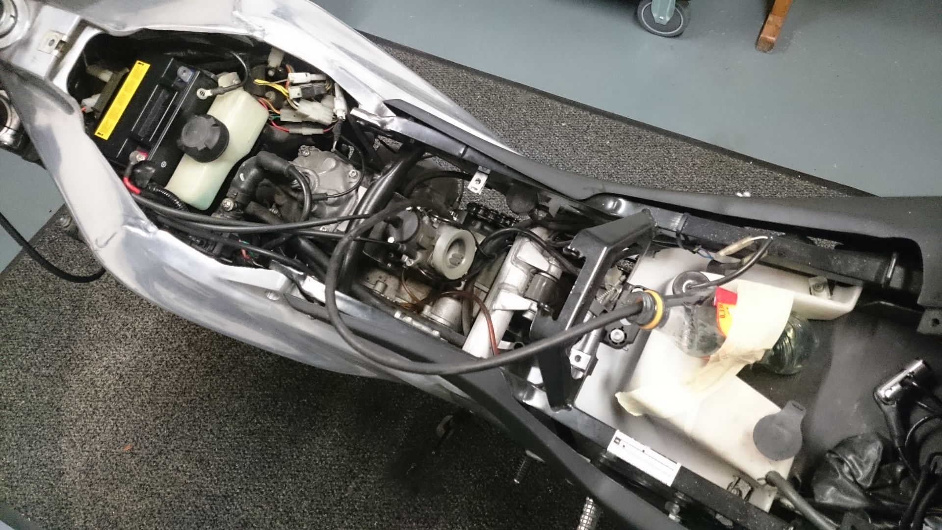 Bevor ich sie zerlege, wollte ich erstmal sehen, ob sie überhaupt läuft- Batterie war beim Kauf ausgebaut und konnte nicht getestet werden. Also neue Batterie gekauft, Vergaser gereinigt und provisorisch mit Sprit versorgt: