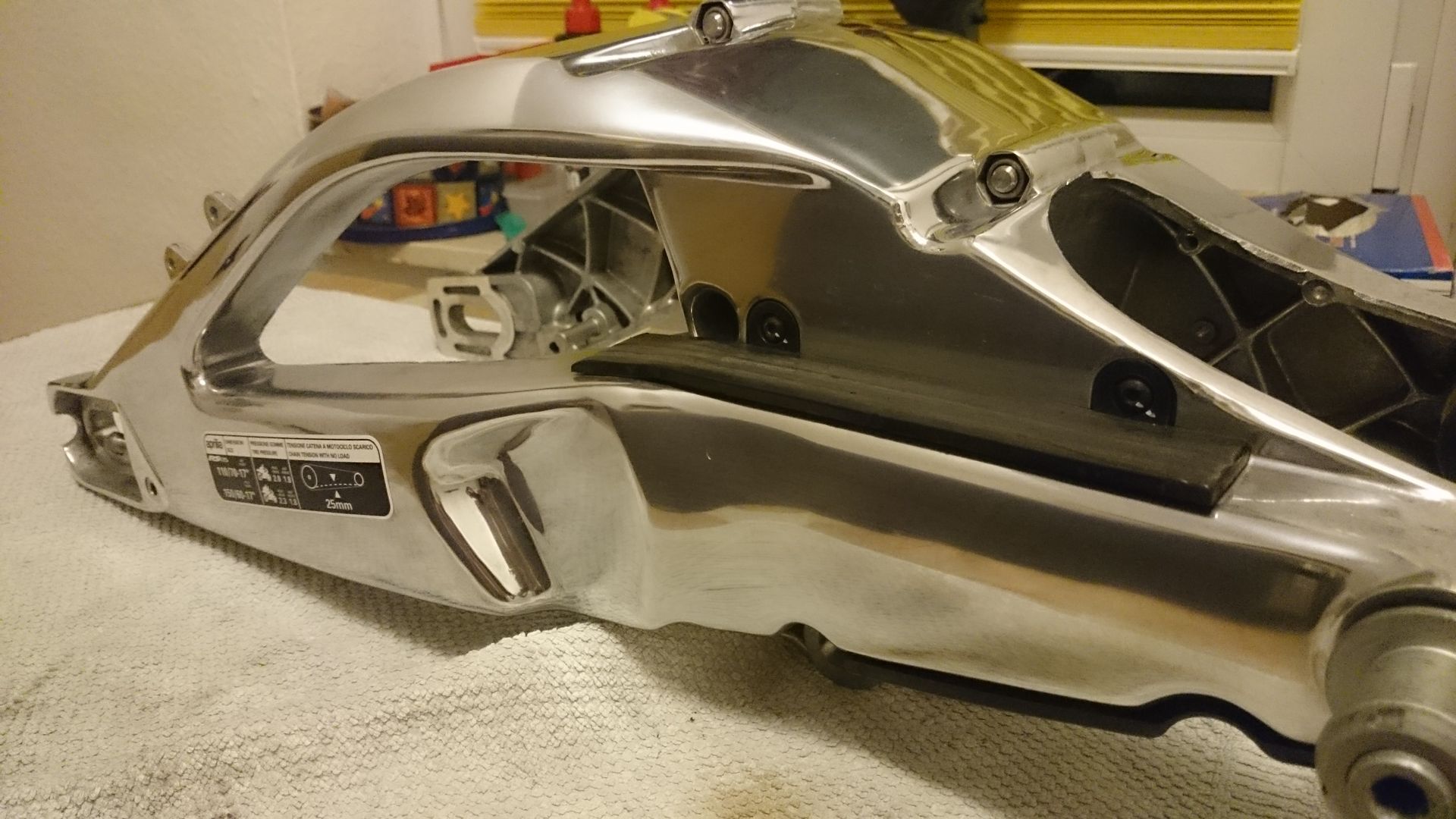 Schwinge und Rahmen sind nun endlich fertig und sehen wieder gut aus. Man braucht nur das richtige Mittel