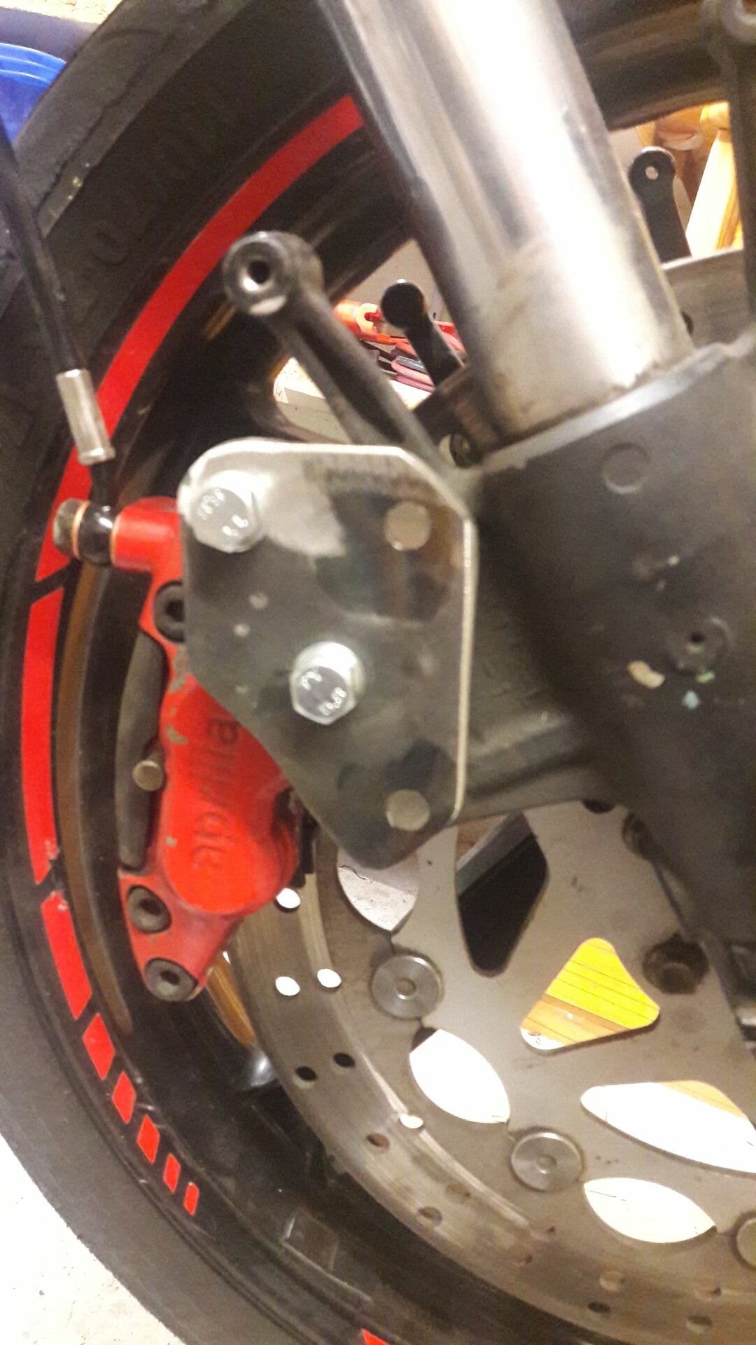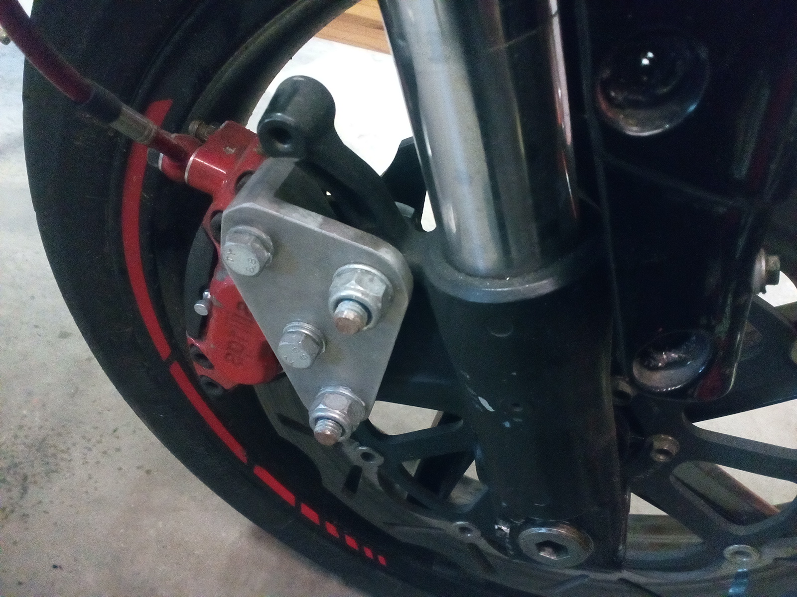 Der schwierigste Teil war das anpassen für den Bremssattel. Habe mir zuerst aus verschieden dicken Stahlplatten und Stücken einen Adapter zusammen gebrutzelt