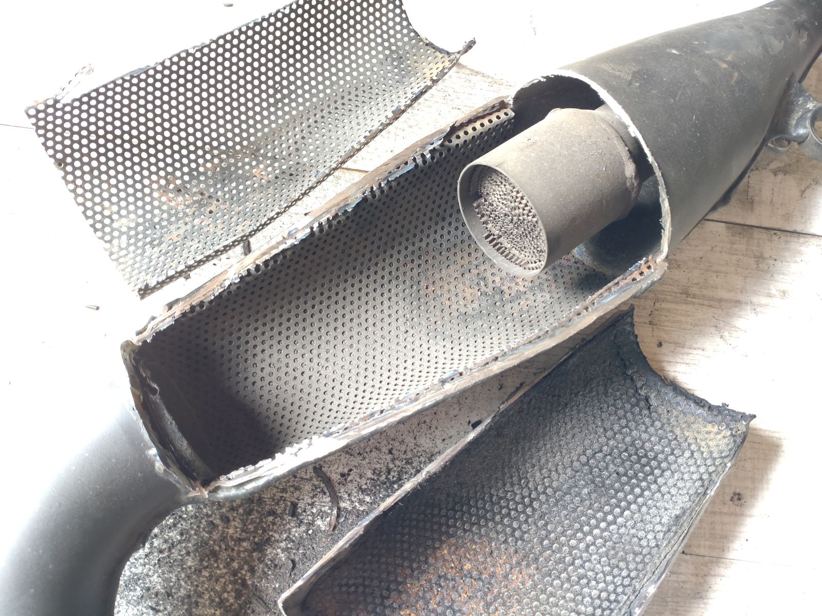 MuS Förster hatte mir beim liegenden Zylinder einen zerbröselten Kat diagnostiziert, darum wollte ich die Original-Anlage auch nicht wieder drunter bauen. Diese Anlage hatte ich jetzt aufgetrennt, um den Kat auszubauen. In der Anlage für den liegenden Zylinder sieht man vorn schon den Übeltäter: