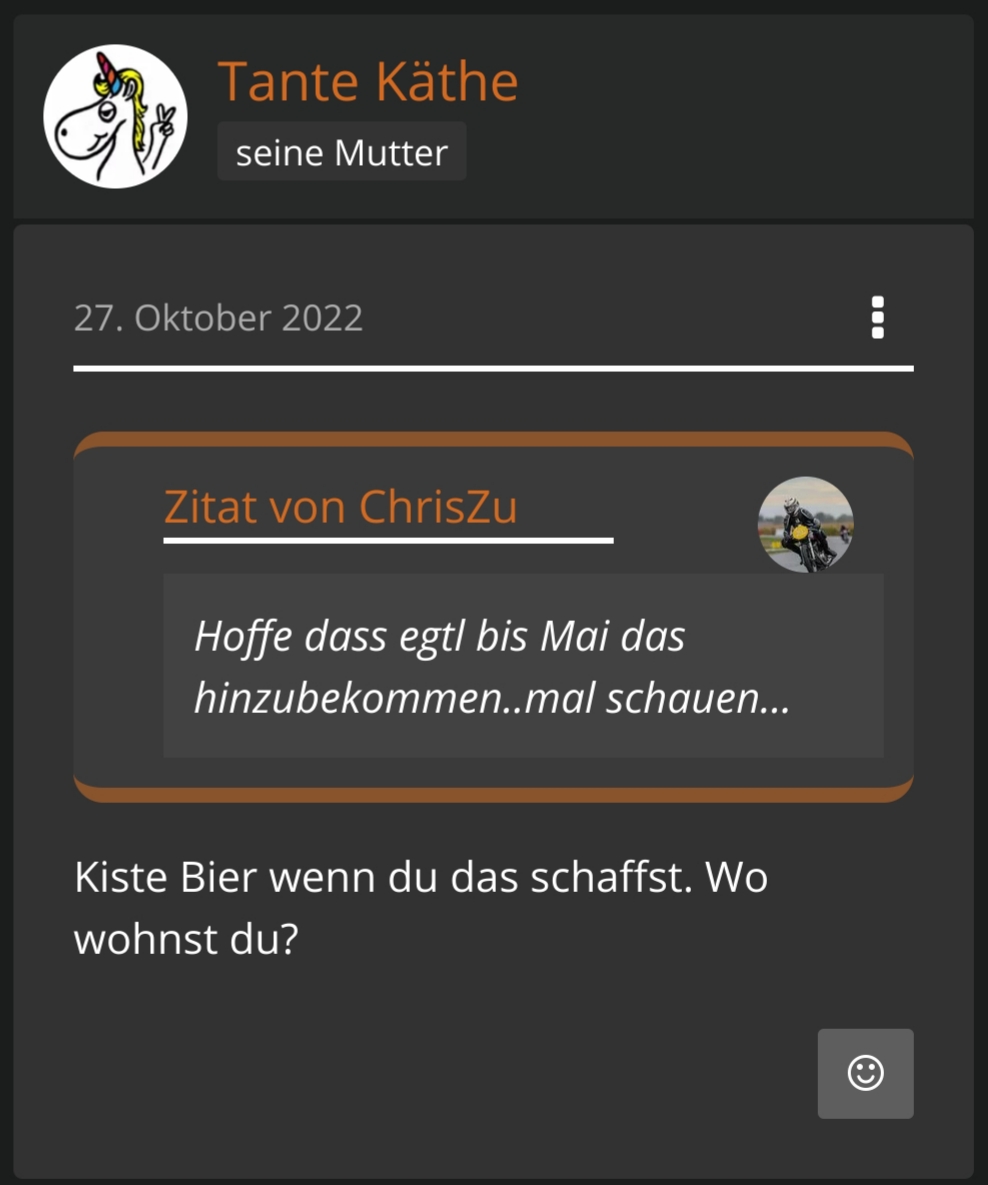 Update zu meiner AF1, sie ist mittlerweile fertig und getüvt. Mit dem Kasten Bier wurde es also leider nichts ( @TanteKähte), allerdings war ich auch ein halbes Jahr im Ausland... Die ersten Fahrversuche wurden ebenfalls schon unternommen, scheint alles zu funktionieren. Eine Sache bereitet mir jedoch Kopfschmerzen, und zwar der Vergaser: