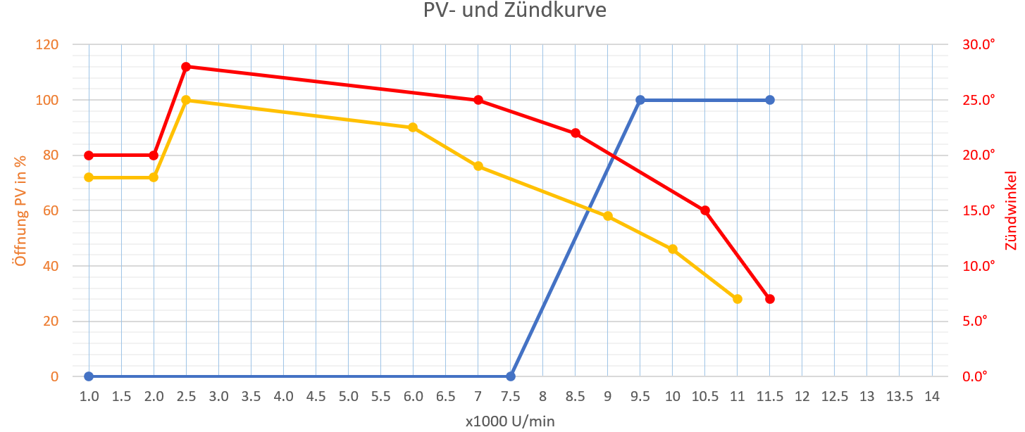 Fällt mir gerade so ein dass die Zündkurve vermutlich mit dran Schuld ist. Wenn ich mich nach Zündkurven so umschaue sind bspw. bei 10500 U/min Peakleistung 15° keine Seltenheit.