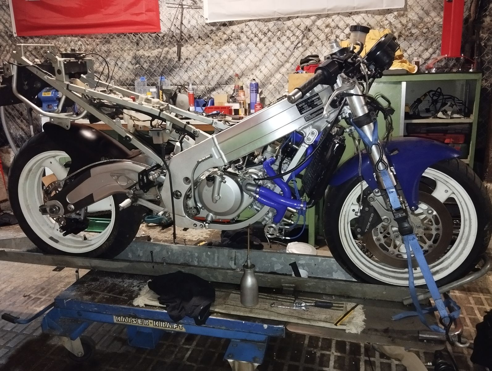 Der Motor sitzt im Rahmen einer 92er Rgv mit Weiß/Blau Lackierung. Die Auslassteuerung von MK hab ich auch montiert. Ignitech ist ebenfalls bestellt und der Einlassstuffer der Vforce Membran wurde zum Stutzen hin angepasst. Es geht mit großen Schritten zum First start.