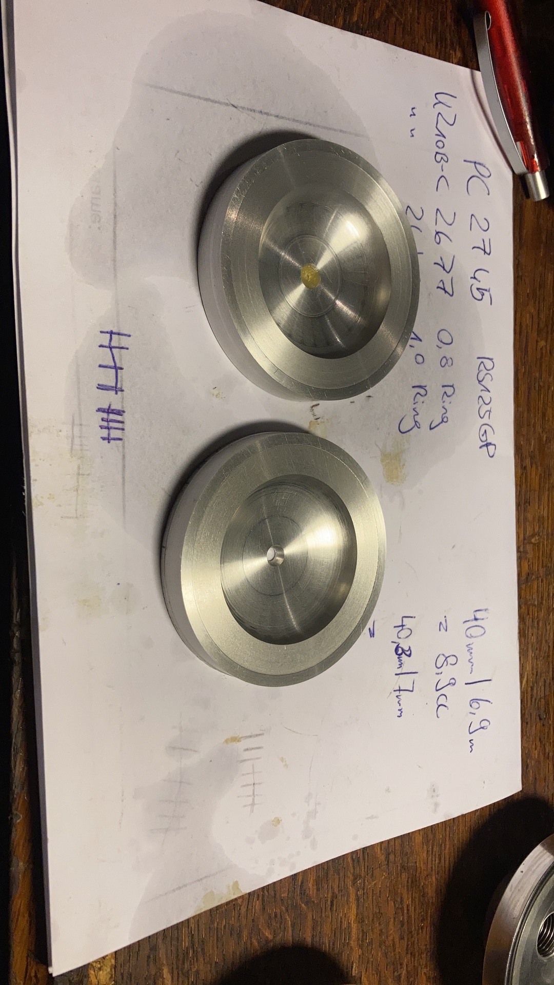 Gefahren werden die flachen Mito Kolben mit nur einem Kolbenring. Das reine Brennraumvolumen wird sich zwischen 9,5-10,5ml bewegen. Quetschspalte geh ich eigentlich ungern unter 0,7mm. Aber ja, je kleiner die QS, desto geringer die Detoneigung.
