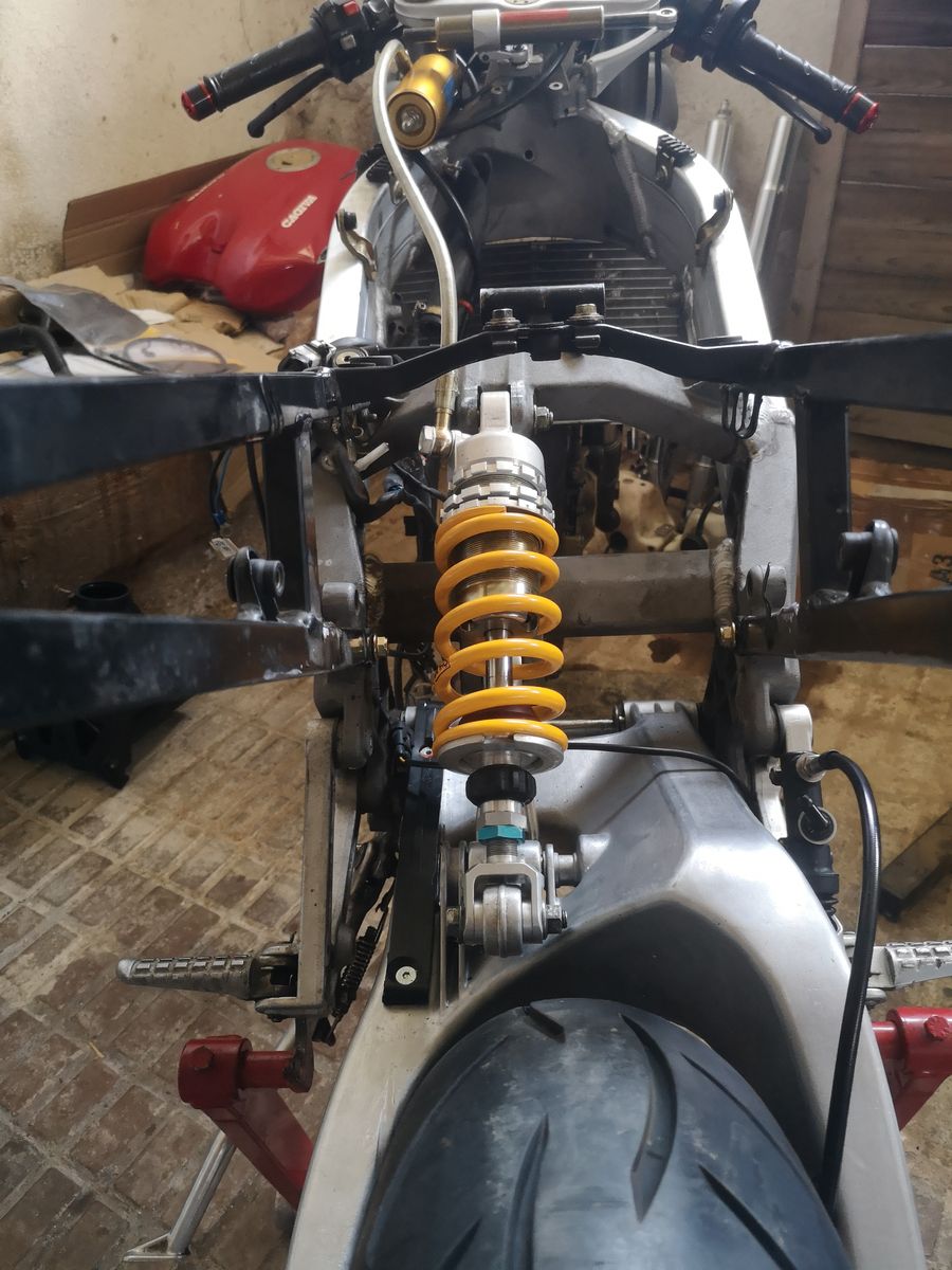 Das Komplette Fahrwerk muss inkl. Aller Lager einmal neu gemacht werden. Dazu kommt ein Öhlins Dämpferchen der Suzuki RGv 250 zum Einsatz. Das muss natürlich umgebaut werden damit ich mit der Länge hinkomme (320mm). Vorn werkelt in Zukunft eine ducati 748 Gabel. Plug&play passt sie, benötigt wird nur der passende Brembosattel und ein angepasstes setting.