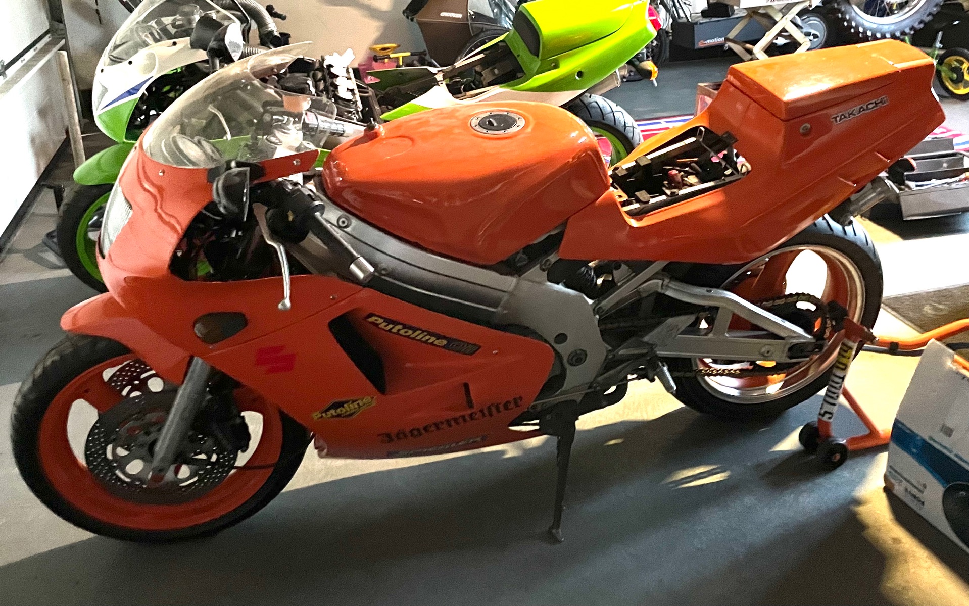 • Ich würde vermuten, dass das eine GSX-R Gabel oder sowas ist. Die obere Gabelbrücke ist auf jeden Fall nicht von der VJ21, die ist nicht plan sondern hat einen Versatz.