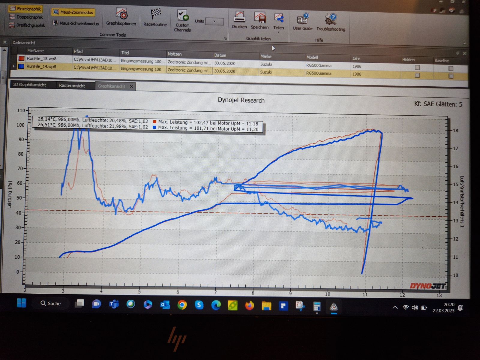 conni, anbei eine Leistunhskurve mit Jolly, Drehsieber mod und Zündung 3° frühzündung ab ca 8.5K und PV von 7.8K auf 8K angepasst damit der kleine Leistungseinbruch wenn die PV zugeht bei 7.8K. Motor ist original keine Änderung an den Zylinder.